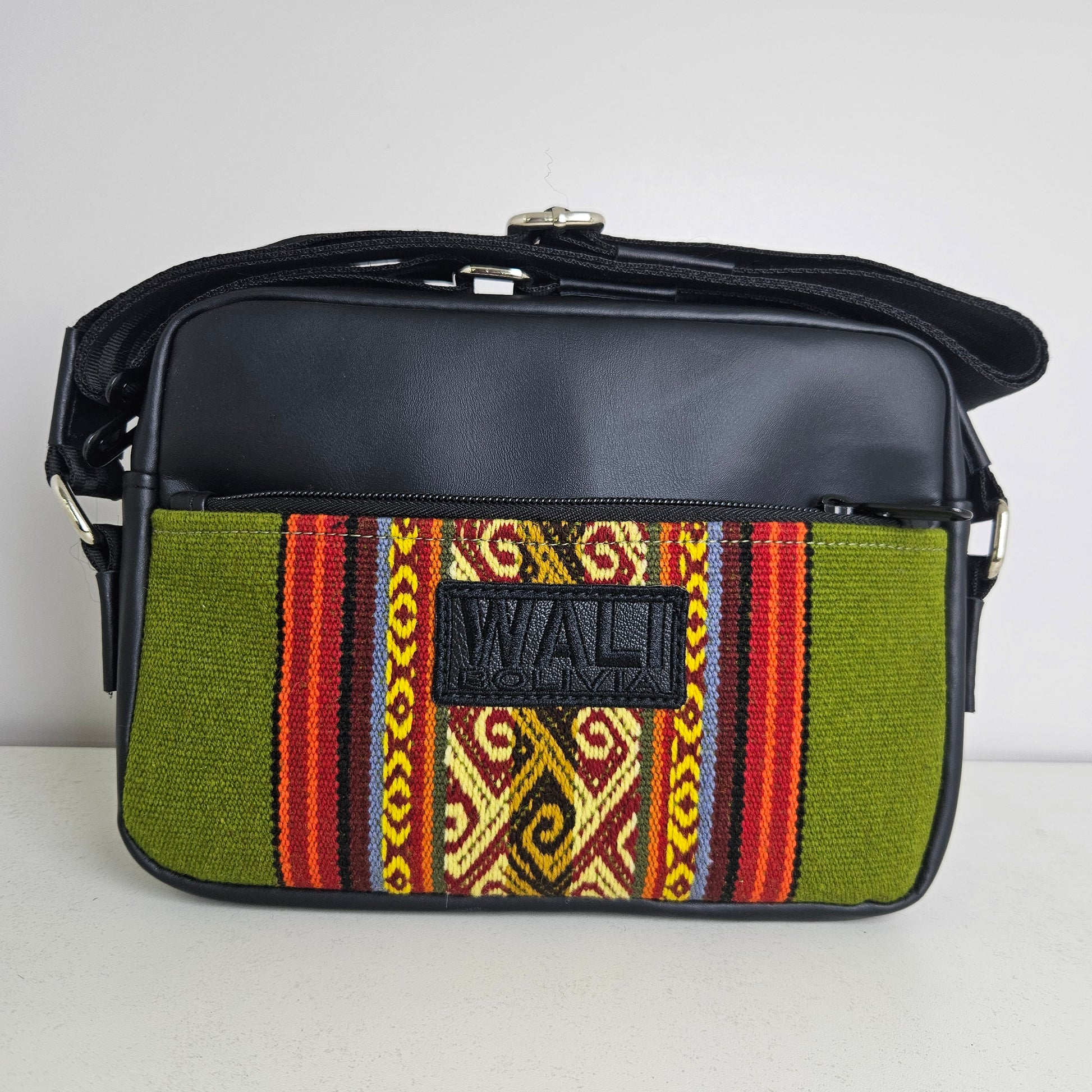 La bandolera de cuero verde pacai, confeccionada con cuero y aguayo natural, ofrece durabilidad y un diseño sostenible. El uso de materiales naturales garantiza una resistencia superior y un estilo único, ideal para quienes valoran la calidad y la originalidad en sus accesorios.