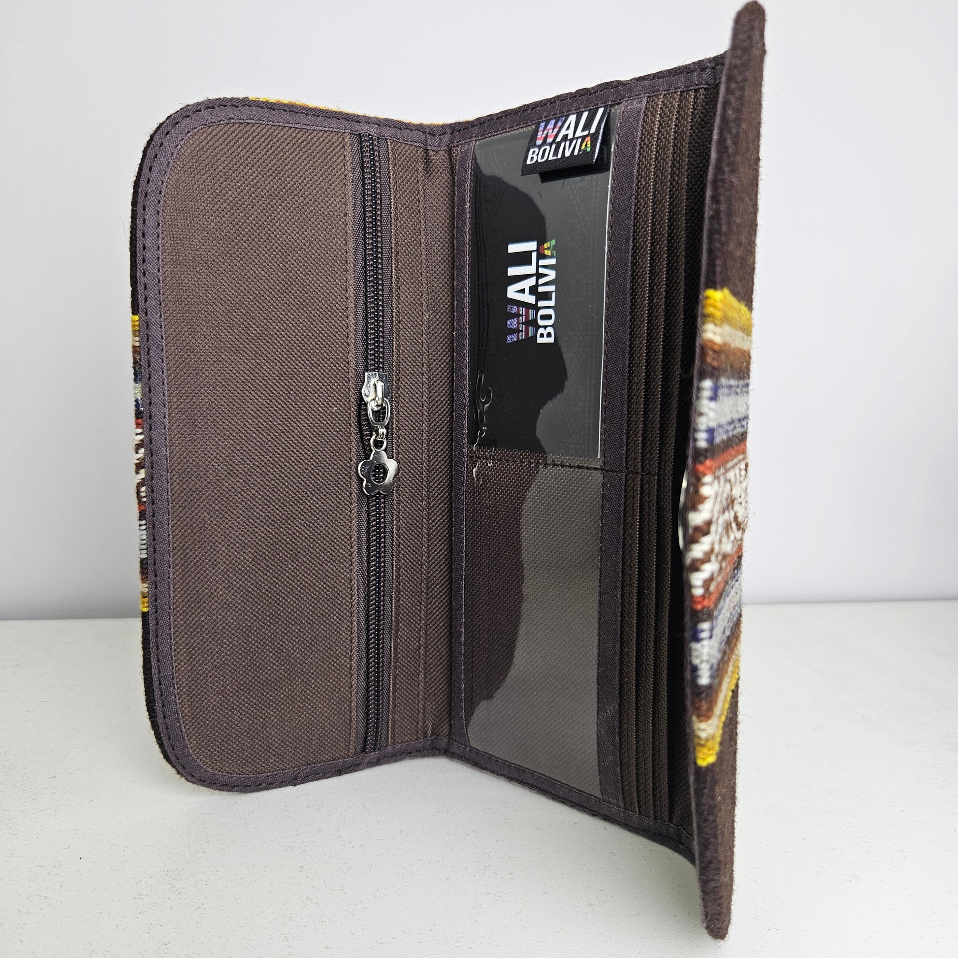 La billetera chequera en chocolate con diseño medio está fabricada con aguayo natural y engomado, garantizando durabilidad y resistencia. Su diseño funcional permite un fácil acceso y organización de documentos, ideal para quienes buscan un producto que combine estética y practicidad en su uso diario.