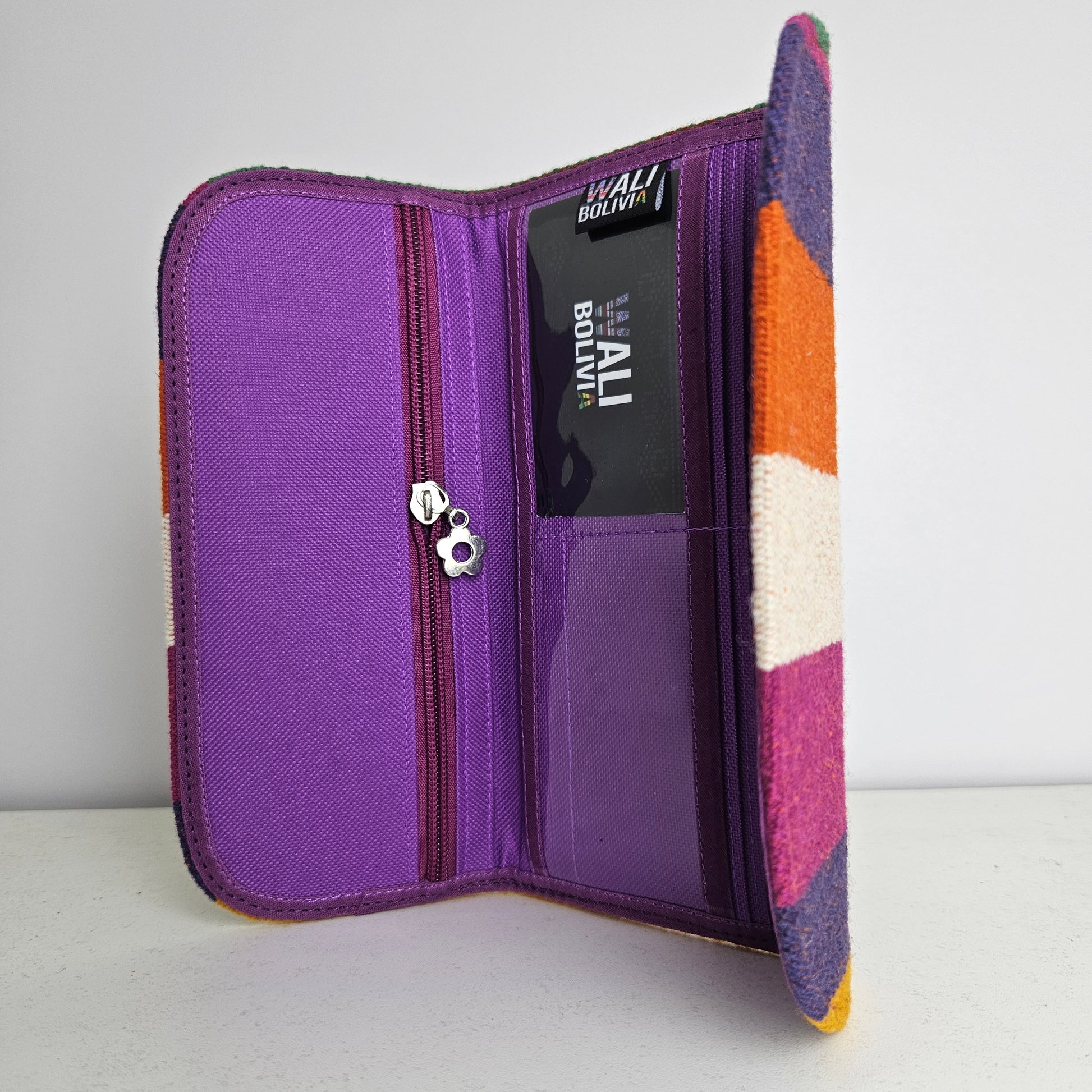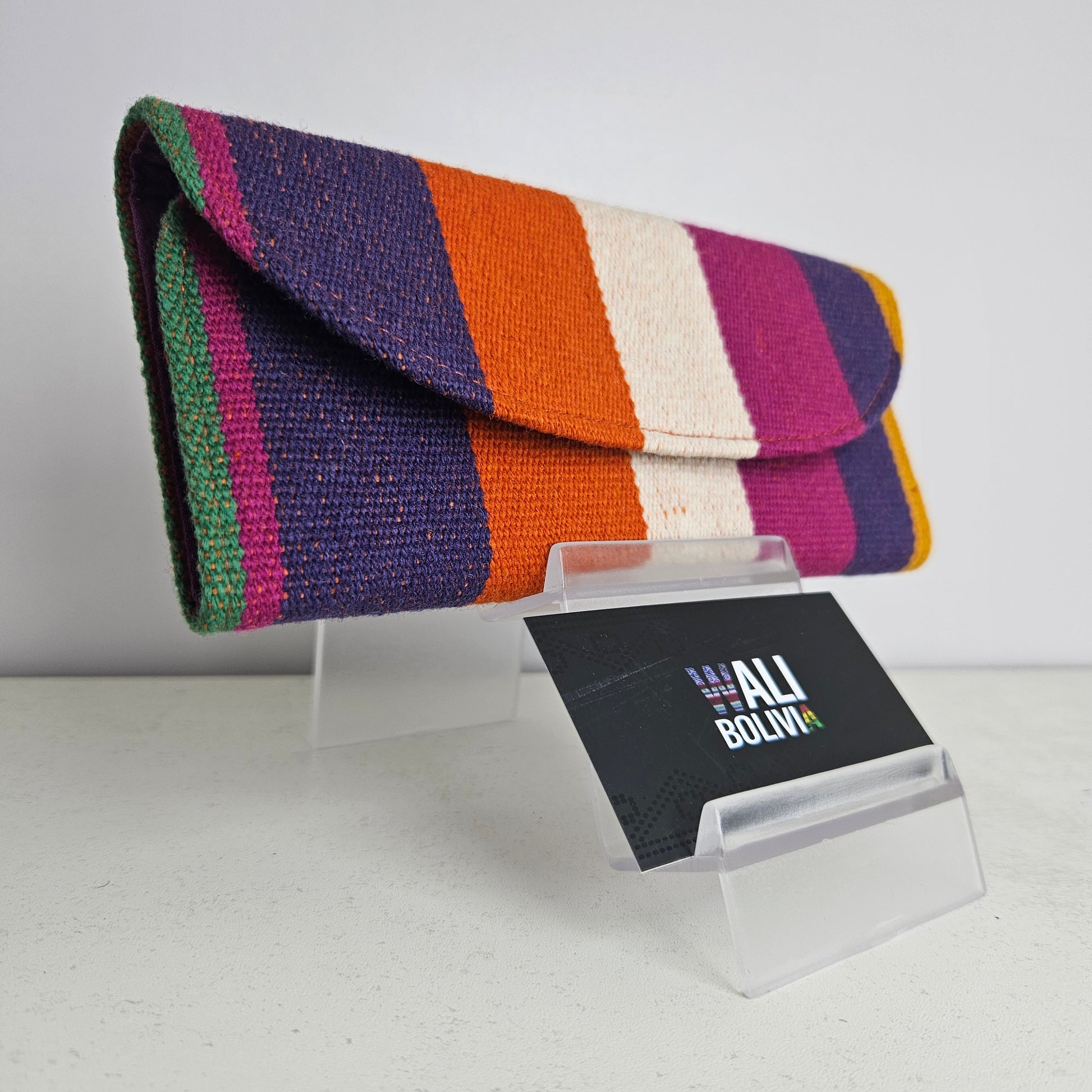 Esta billetera chequera está hecha de aguayo natural y está engomada para mayor durabilidad. Con su diseño de color violeta, se destacará entre las demás. Esta billetera es la opción perfecta para aquellos que buscan un producto duradero y atractivo al mismo tiempo.