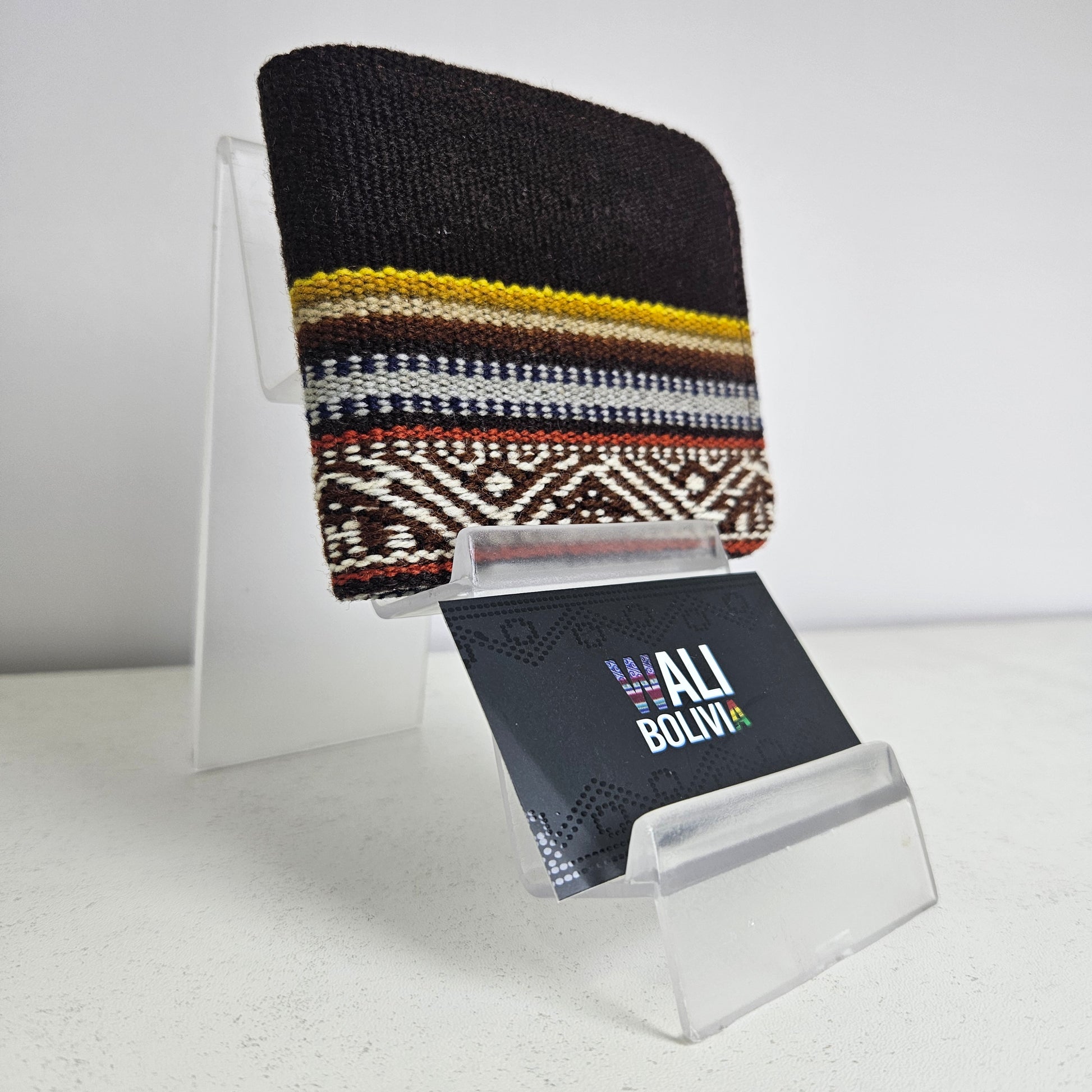 La billetera doble en color café chocolate está elaborada con aguayo natural y engomada, lo que proporciona una durabilidad excelente y una textura única. Su diseño funcional permite organizar eficientemente tarjetas y billetes, optimizando el uso diario. Ideal para quienes valoran la calidad y la estética en sus accesorios.