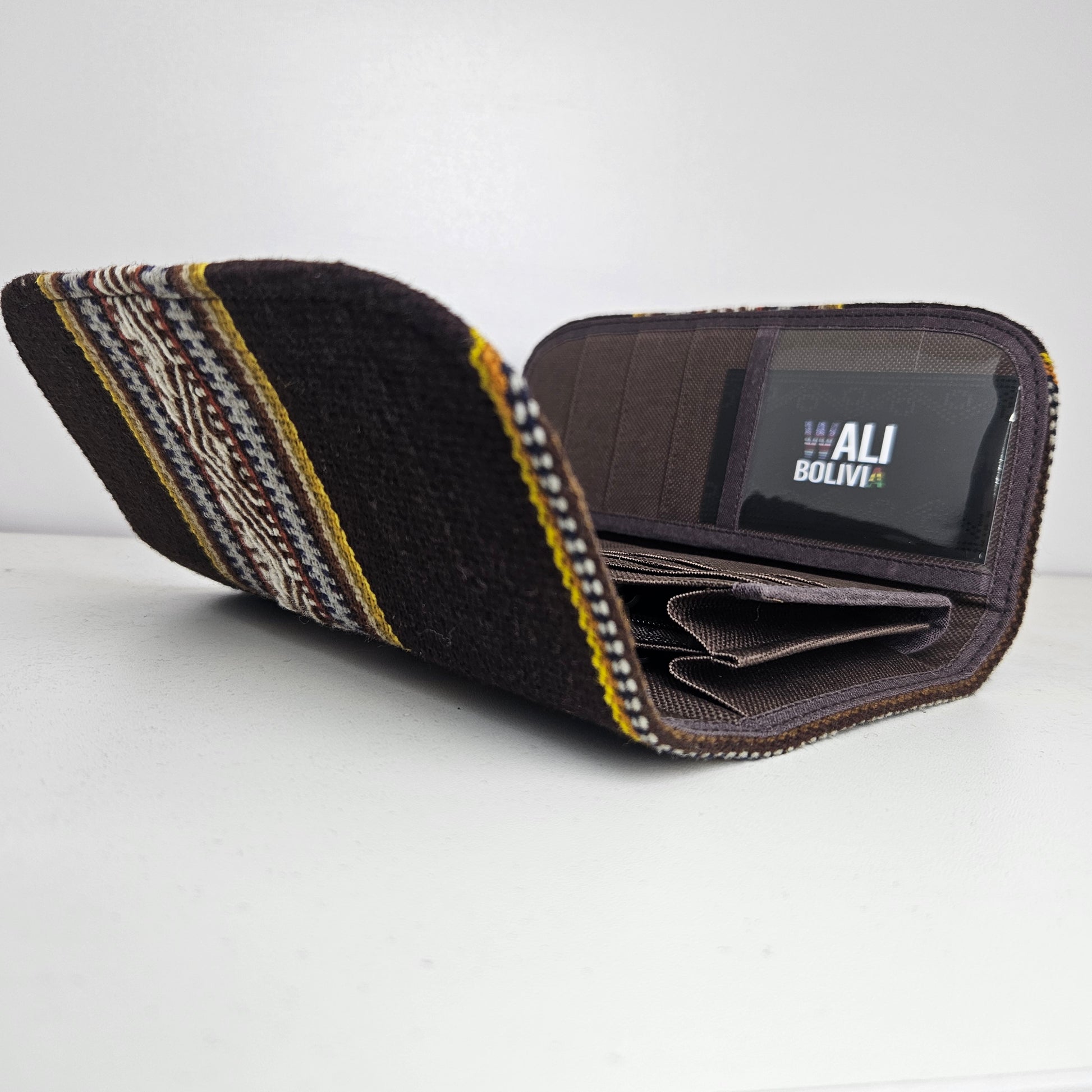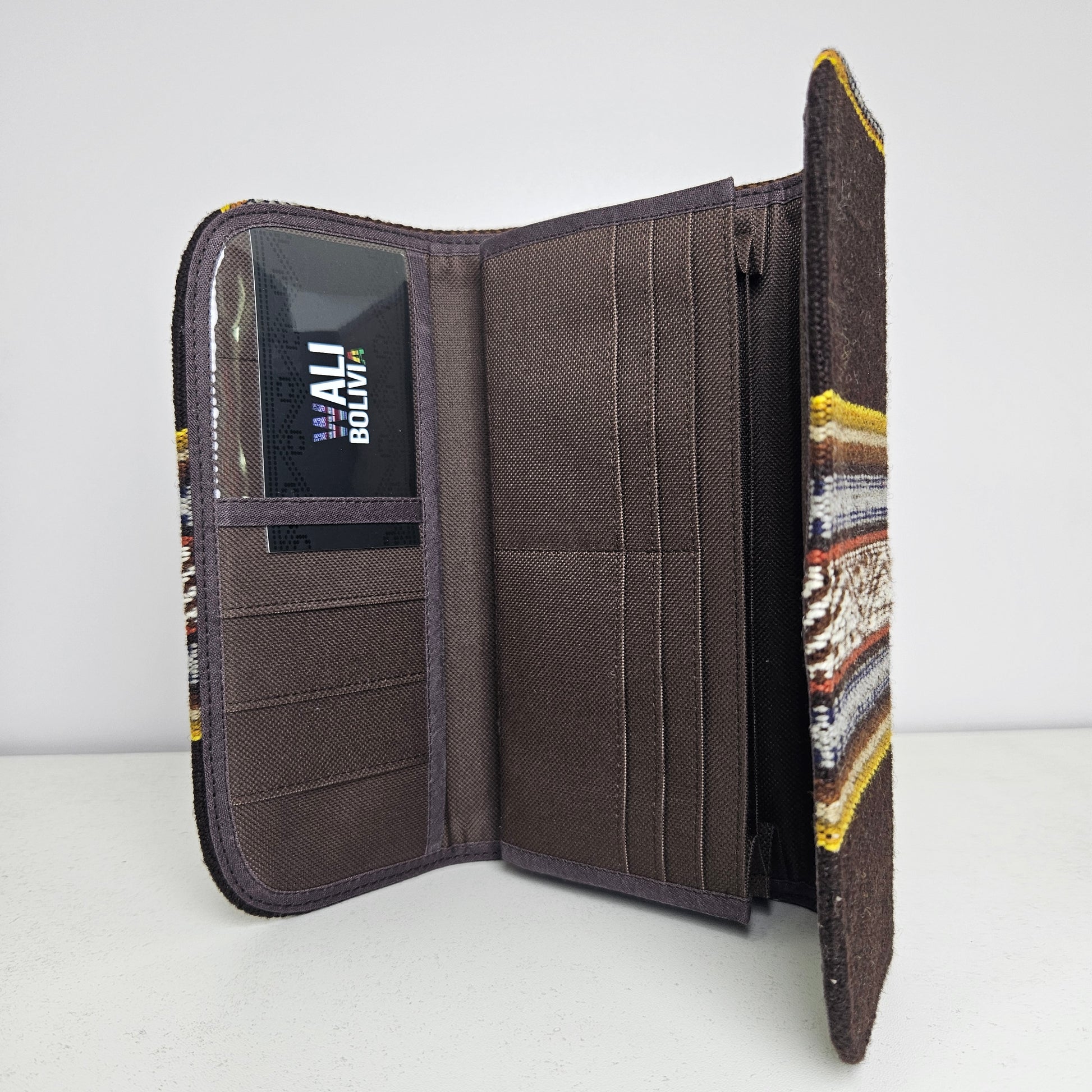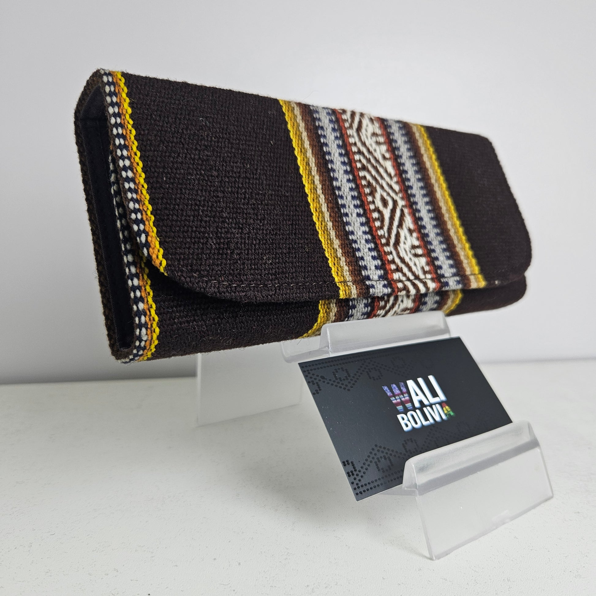 Esta billetera portacelular está hecha de aguayo natural y cuenta con un diseño medio en café, haciéndola perfecta para cualquier ocasión. Además de ser un accesorio estético, esta billetera también ofrece una solución conveniente para llevar tu celular contigo de manera segura. Con su diseño engomado, ¡puedes estar seguro de que tu celular estará protegido en todo momento!