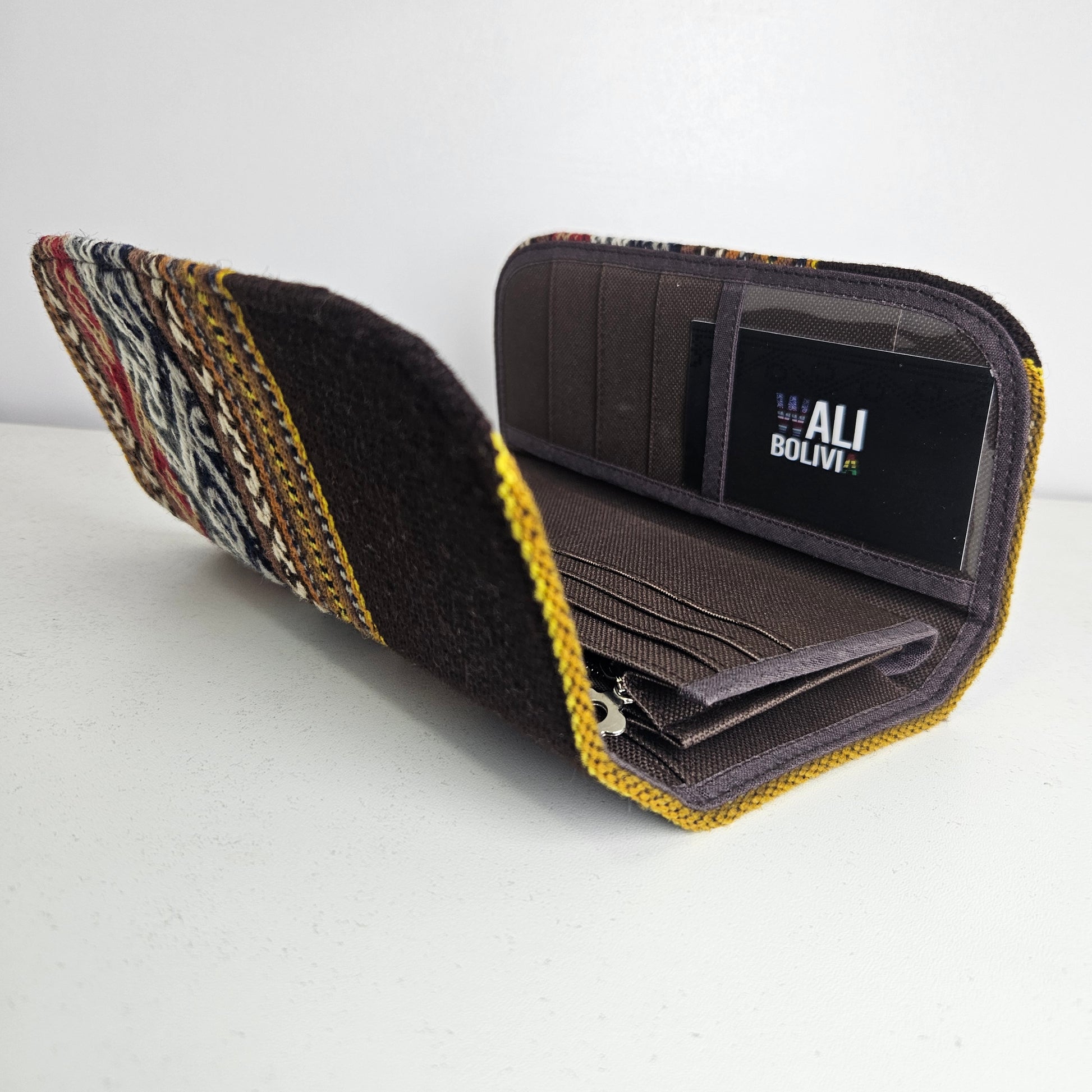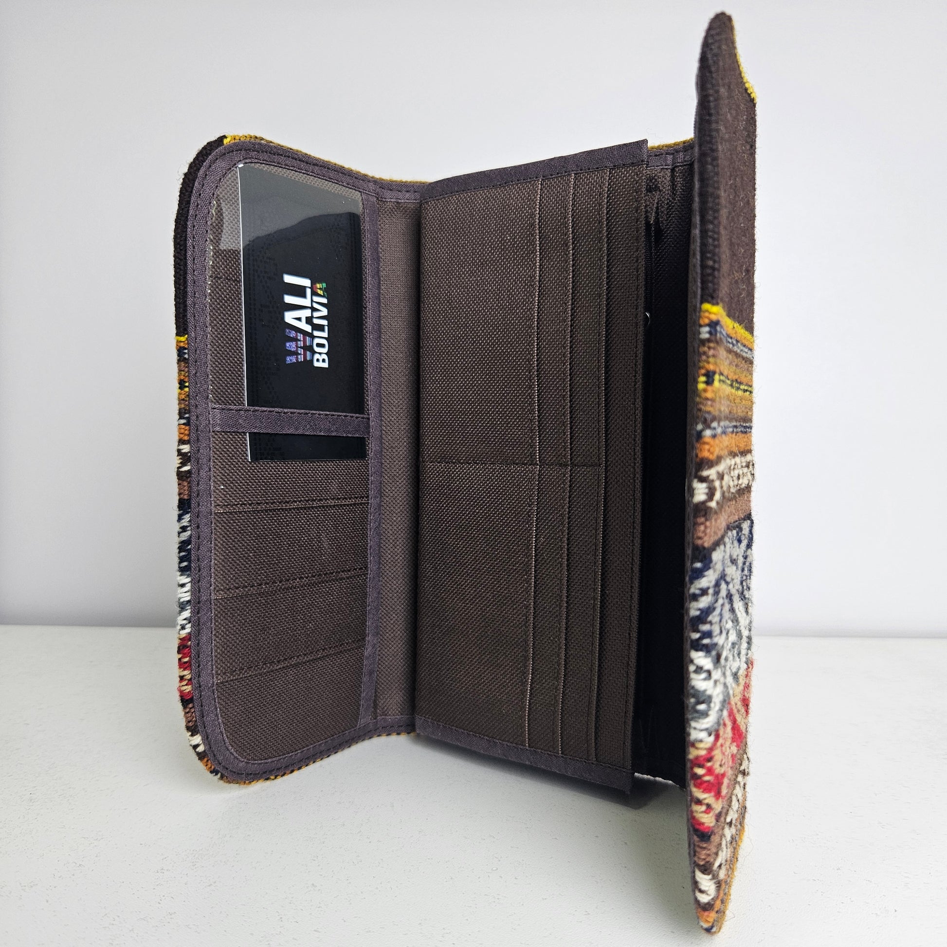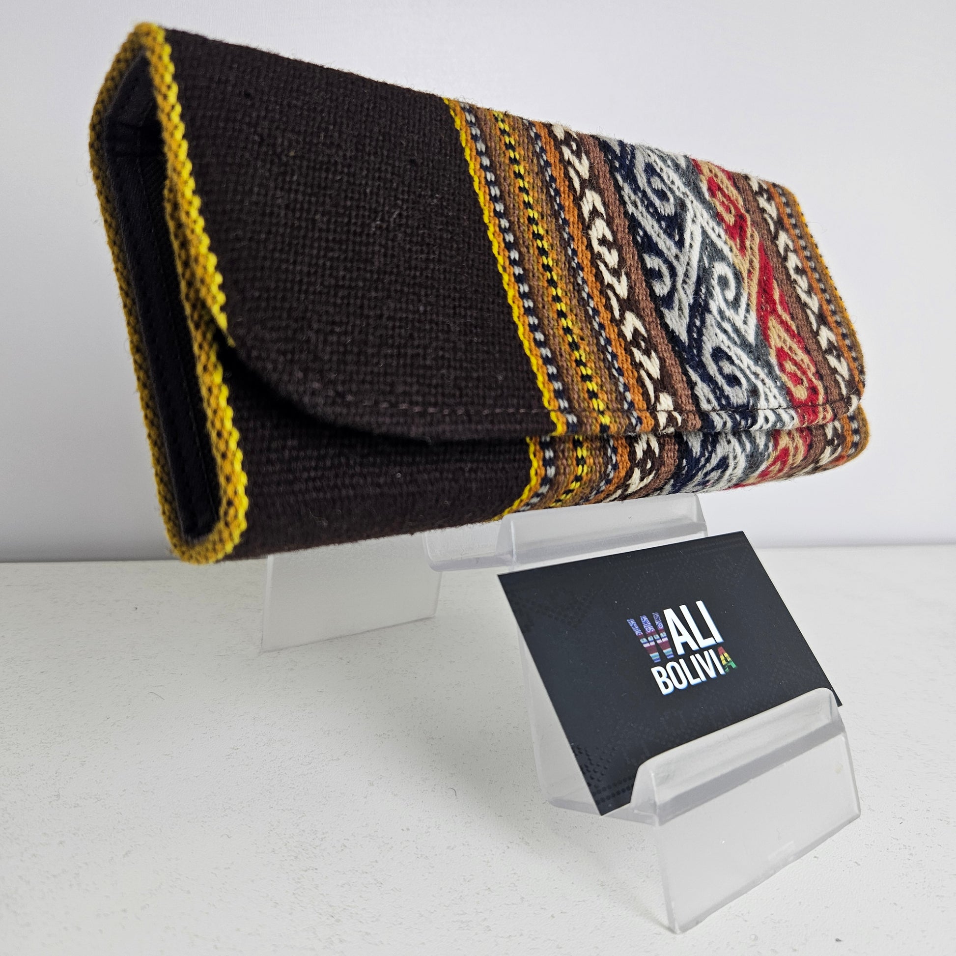 La Billetera Portacelular en color chocolate está fabricada con aguayo natural y engomada, ofreciendo una combinación de durabilidad y estilo. Su diseño permite un fácil acceso a su teléfono móvil, mientras que el material asegura una protección adecuada. Ideal para quienes buscan funcionalidad sin sacrificar la estética.