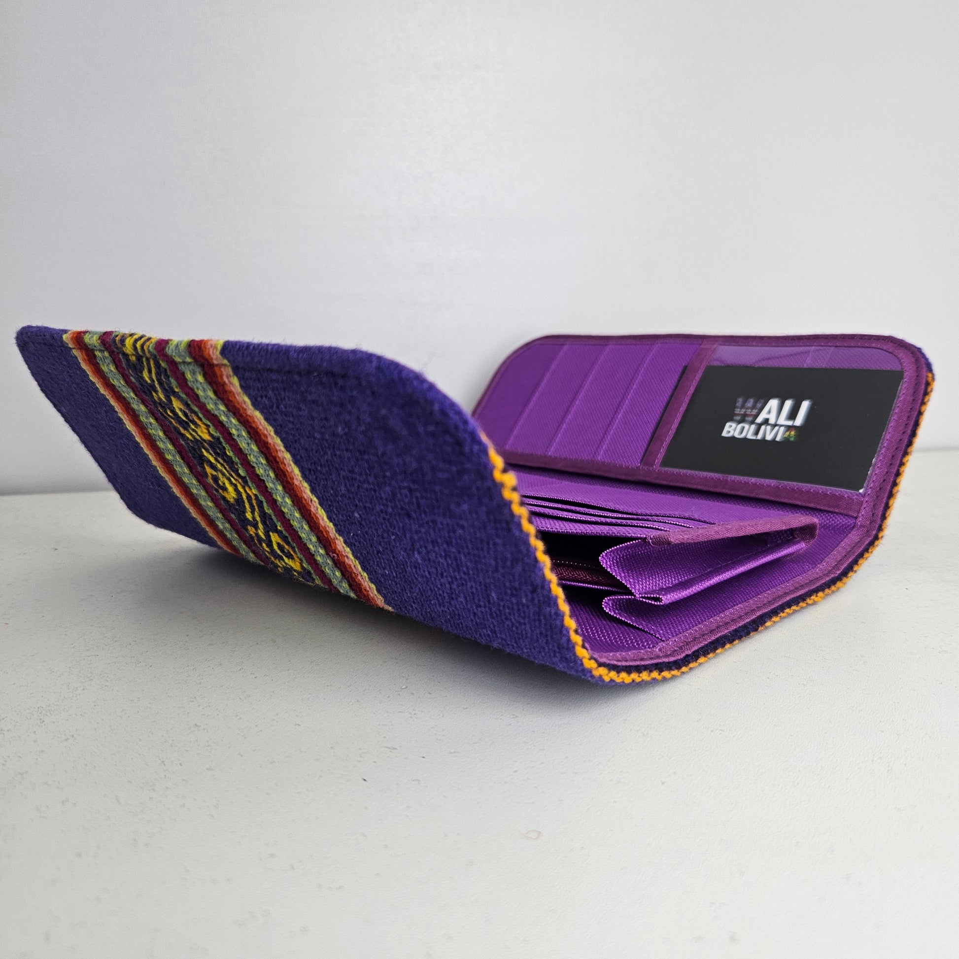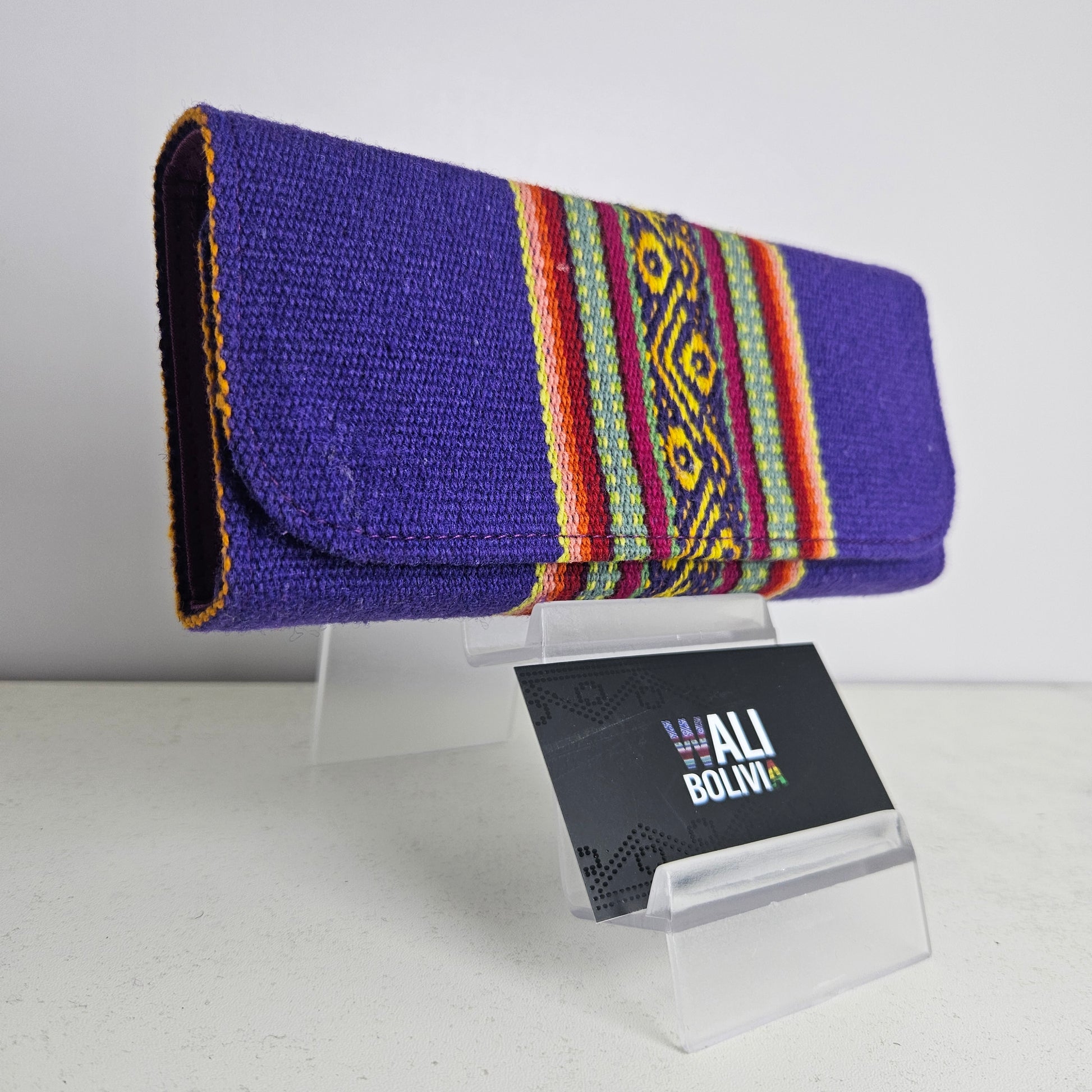 Billetera Portacelular (índigo diseño medio): Confeccionada con aguayo natural y un revestimiento engomado, esta billetera combina estilo y practicidad para llevar tus tarjetas y celular en un solo lugar. Mantén tus pertenencias seguras y a mano con este accesorio de diseño único. ¡Descubre la combinación perfecta de tradición y modernidad en una sola cartera!