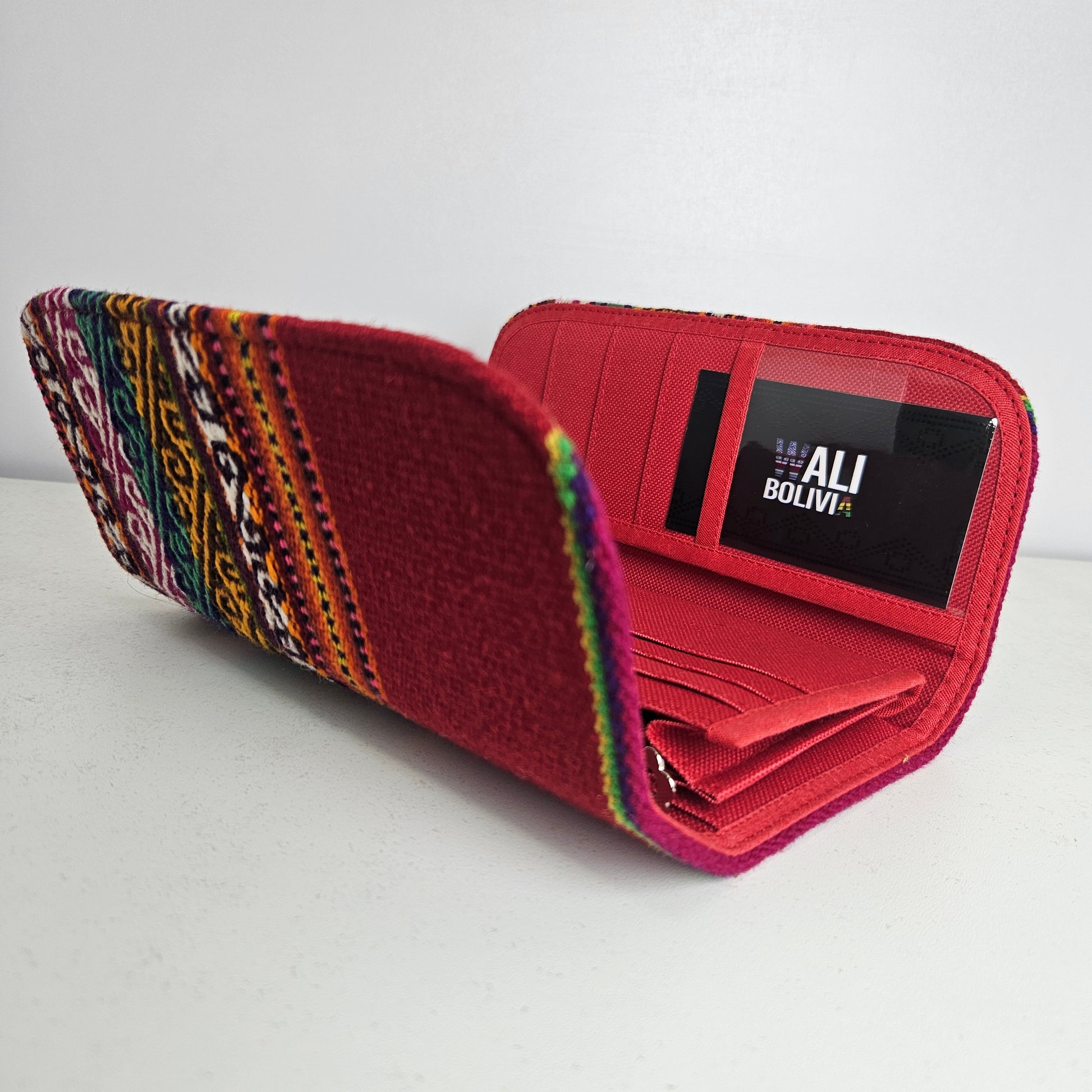 La billetera portacelular en rojo carmín está fabricada con aguayo natural y engomado, ofreciendo durabilidad y un diseño atractivo. Su material proporciona resistencia al desgaste, asegurando una larga vida útil, mientras que su color vibrante aporta un toque distintivo a su portafolio diario.