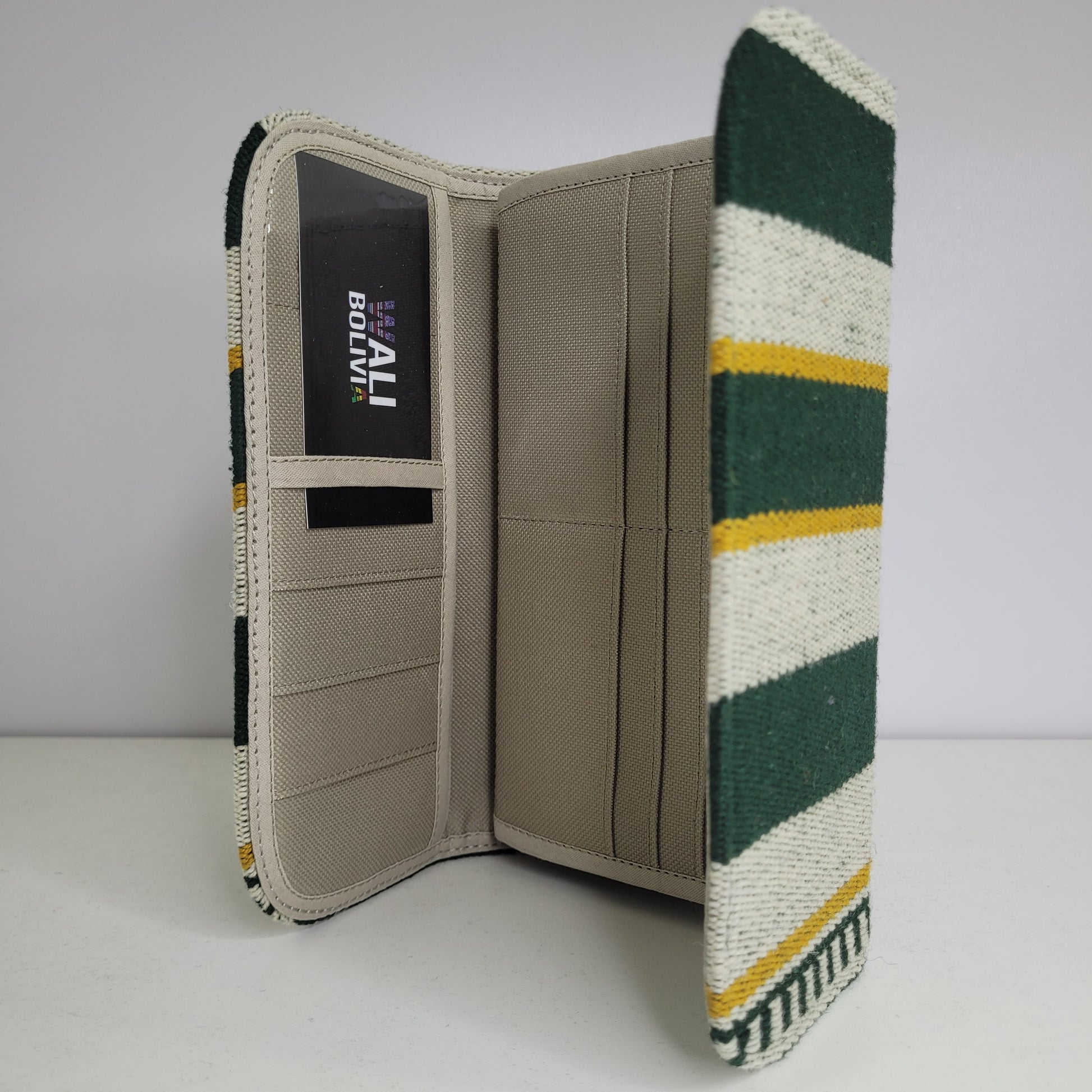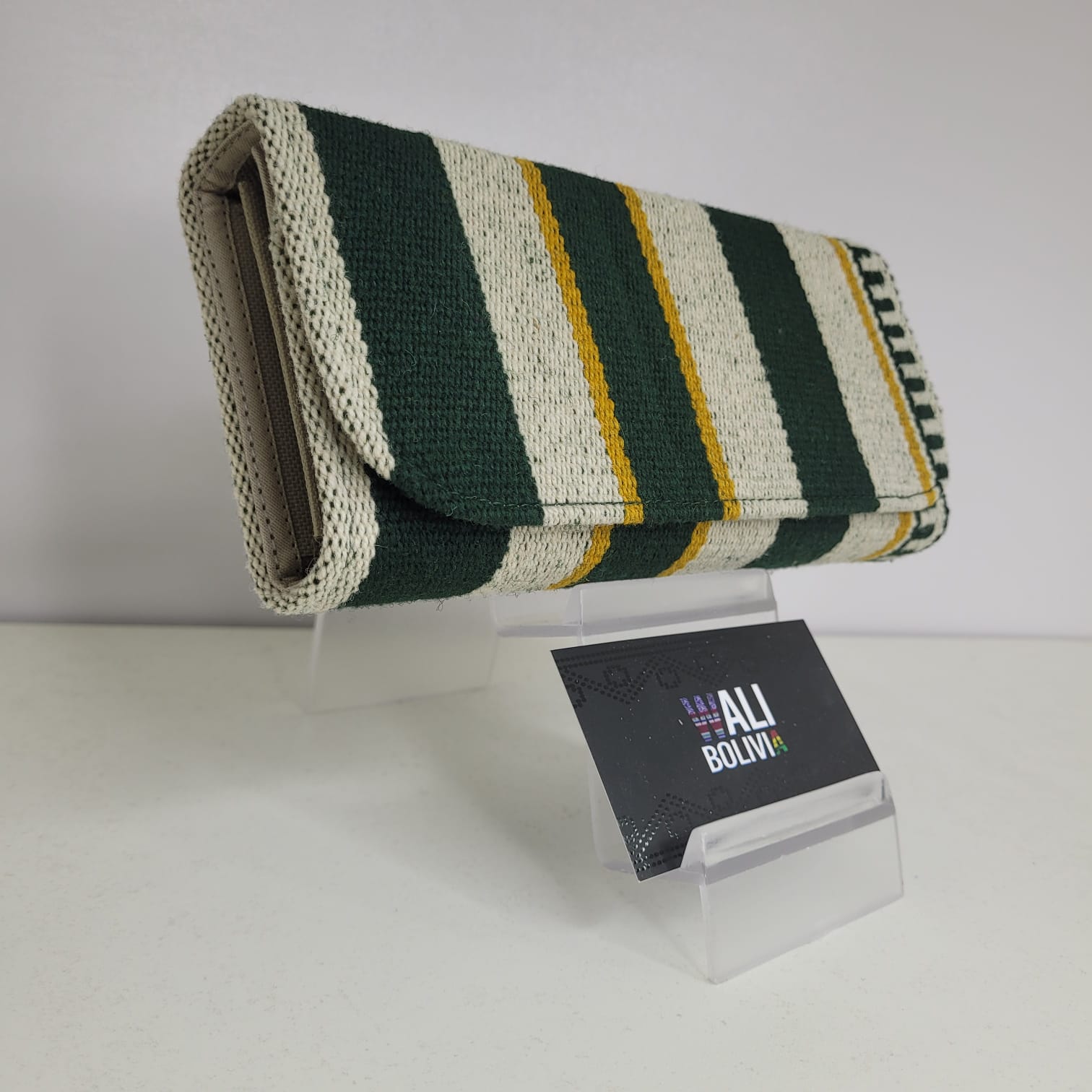 Esta billetera portacelular en color verde a franjas es el nuevo modelo que estabas buscando. Con su diseño único y moderno, podrás llevar todo lo que necesitas en un solo lugar de manera segura y elegante. ¡No esperes más para tenerla en tus manos!