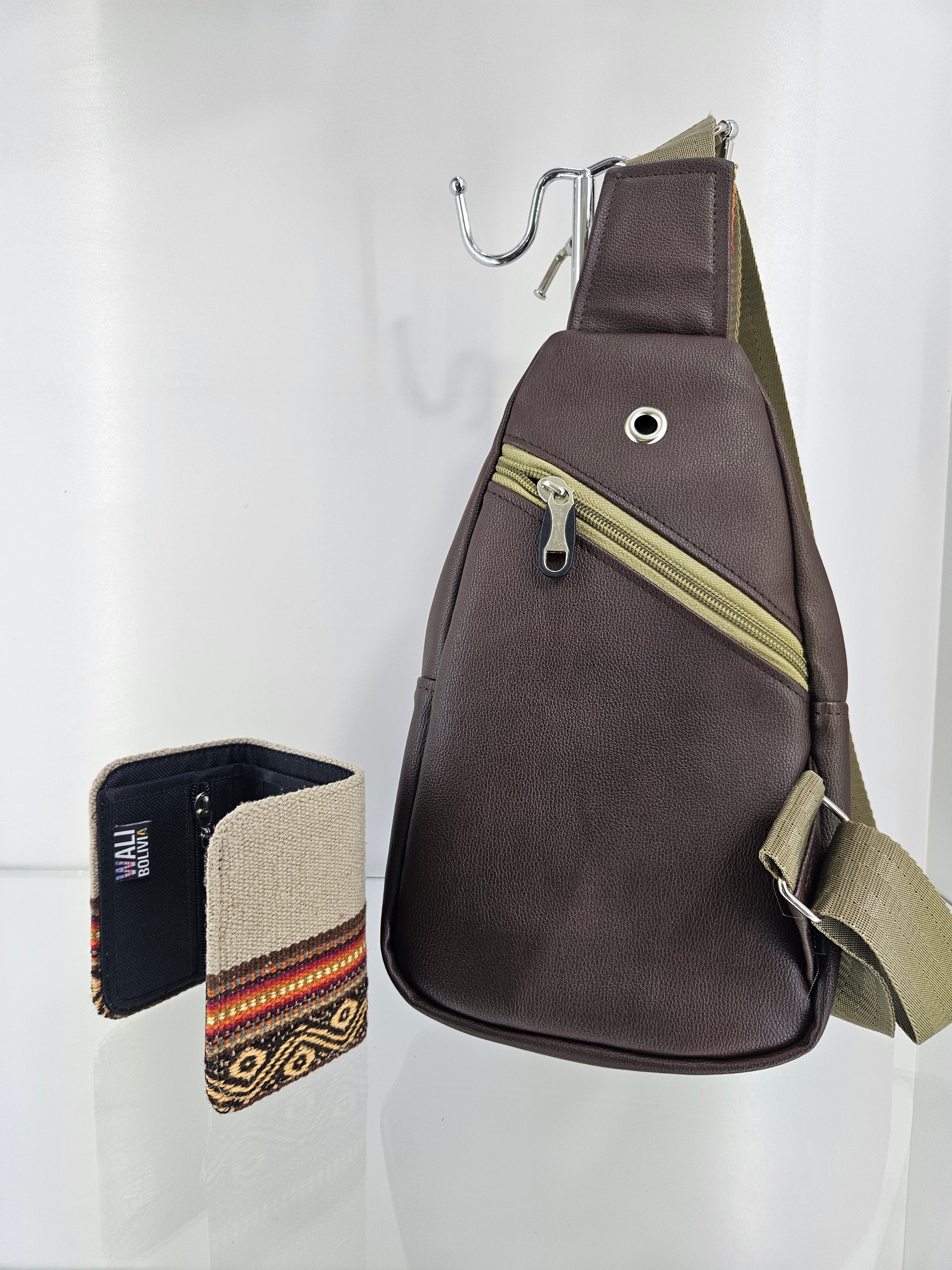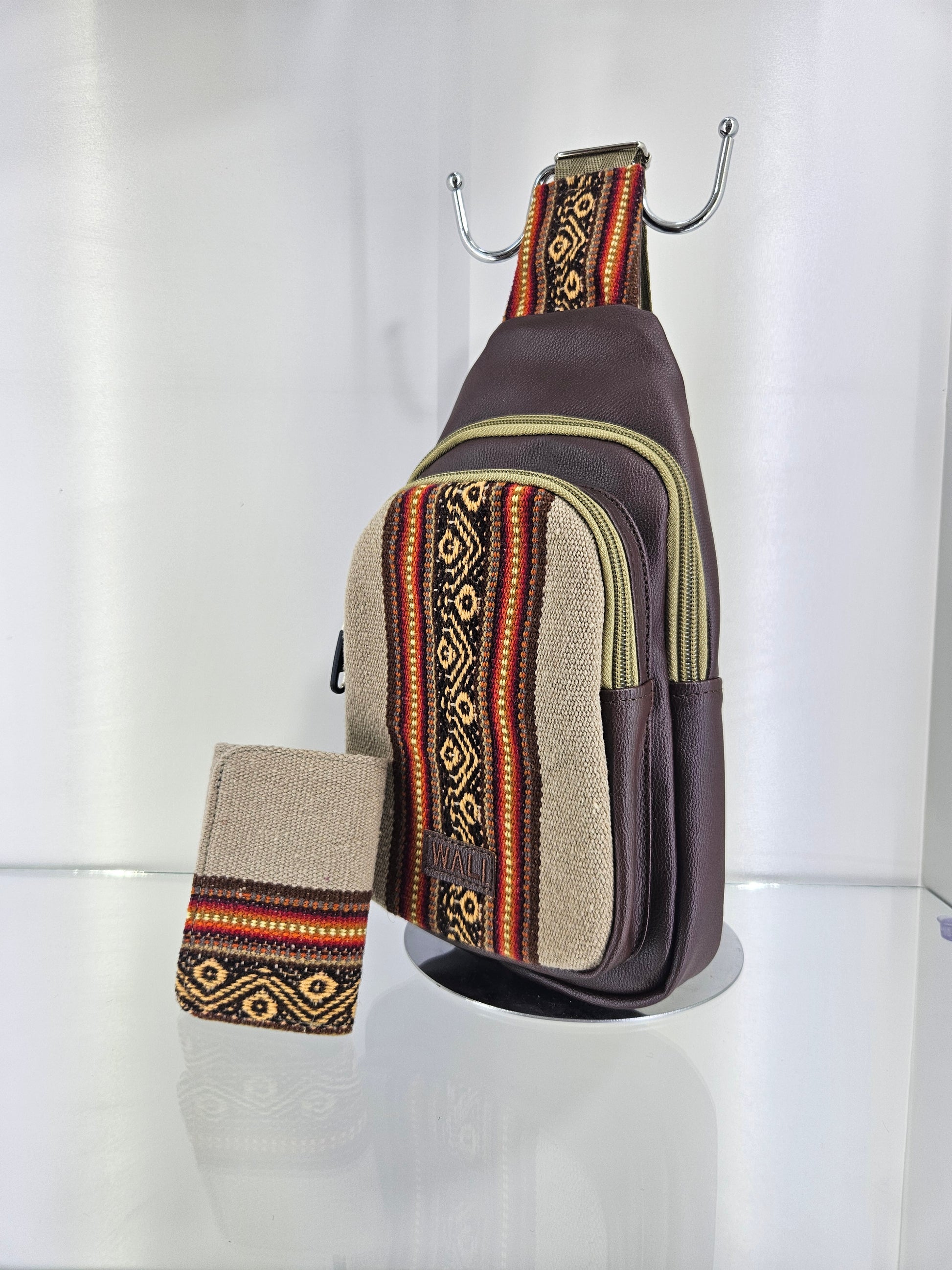 El Combo Pechera y billetera triple en color beigue combina la durabilidad del aguayo natural con la modernidad del ecocuero. Esta pechera ofrece un diseño funcional y atractivo, mientras que la billetera proporciona un almacenamiento eficiente. Ambas piezas son ideales para el uso diario, garantizando resistencia y estilo.