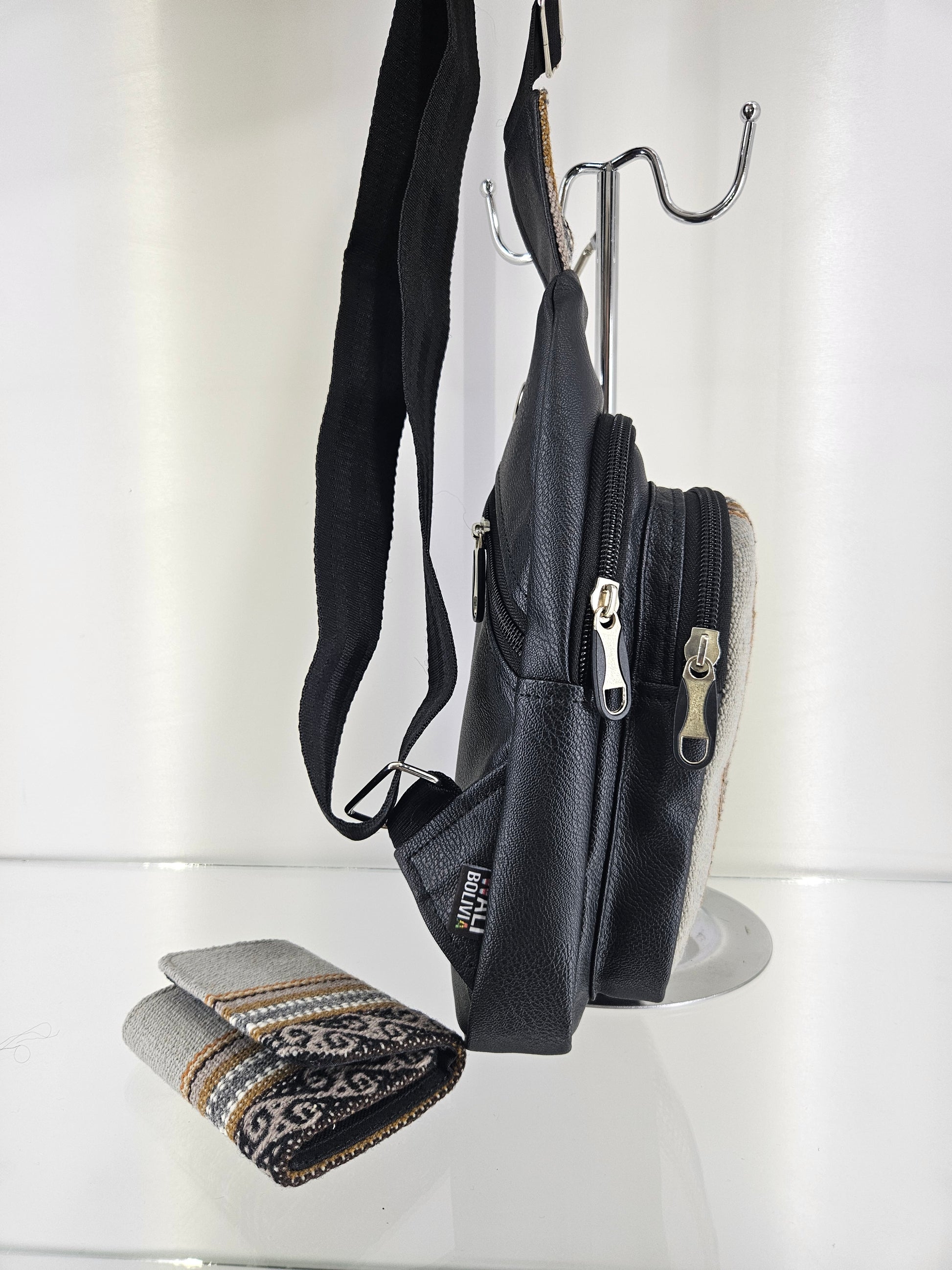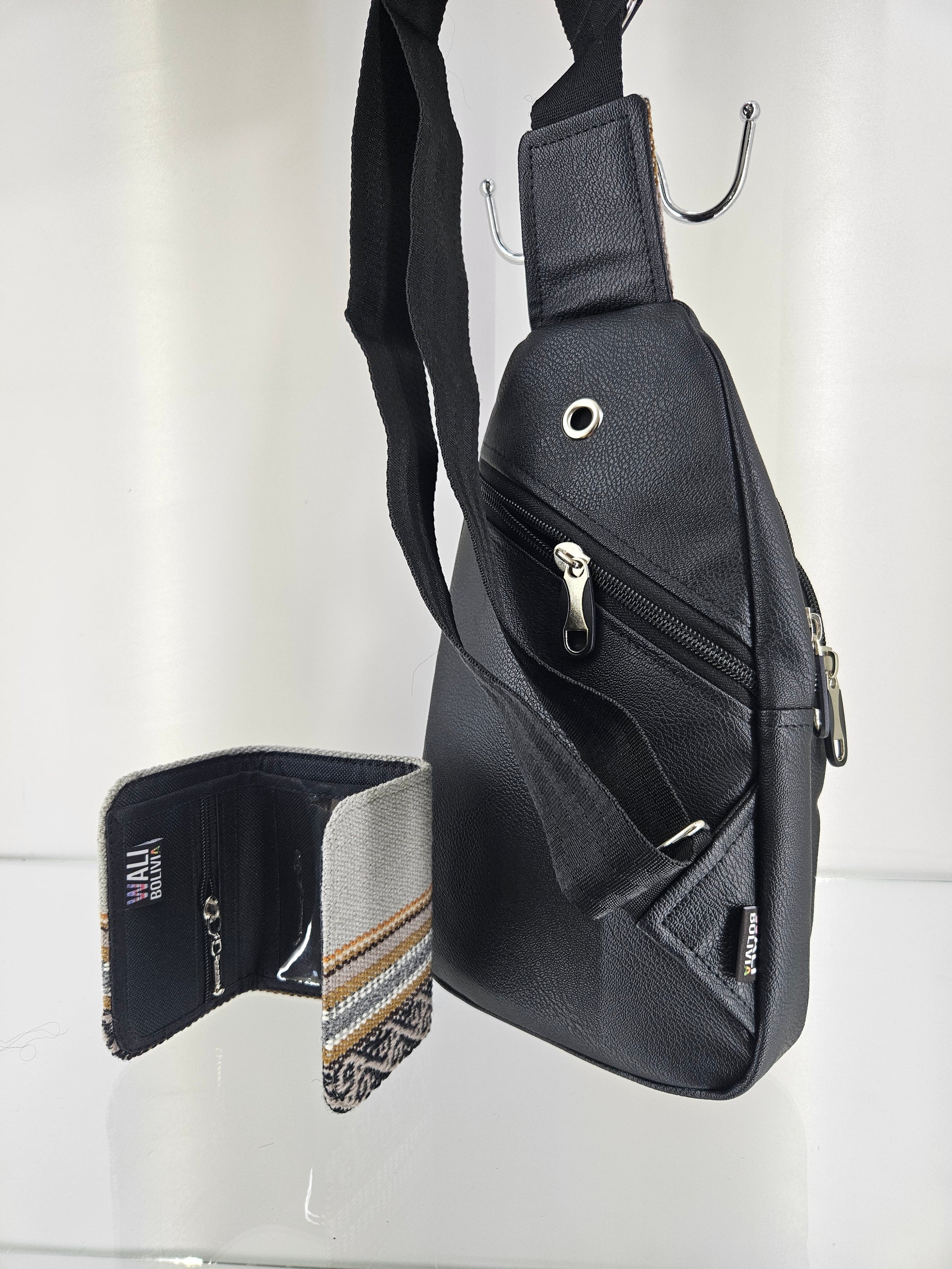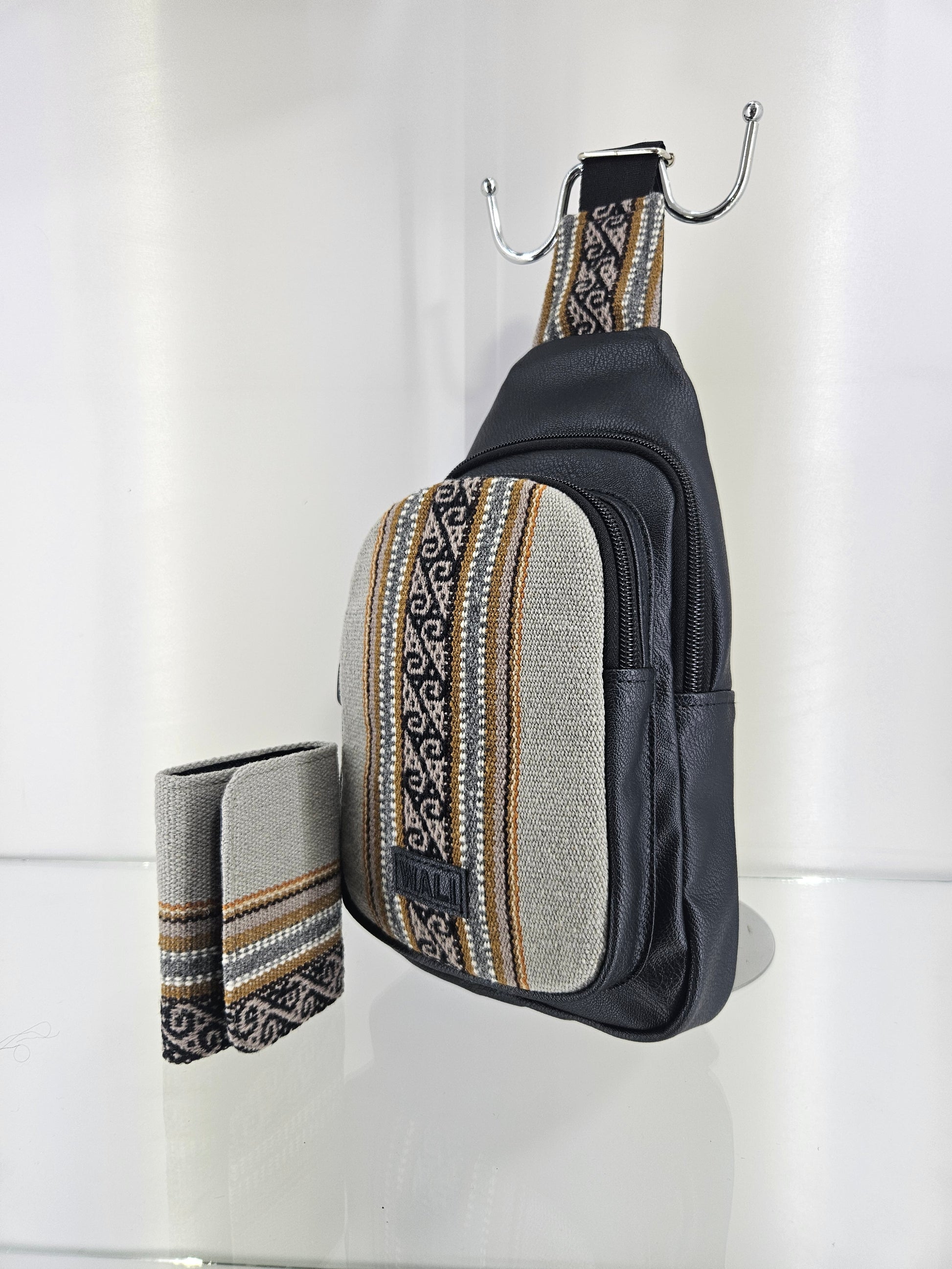 El Combo Pechera y billetera triple combina materiales de aguayo natural y ecocuero, ofreciendo durabilidad y resistencia al desgaste. Su diseño funcional asegura un fácil acceso a tus pertenencias, mientras que el uso de aguayo natural promueve la sostenibilidad. Ideal para quienes buscan estilo y practicidad en su día a día.