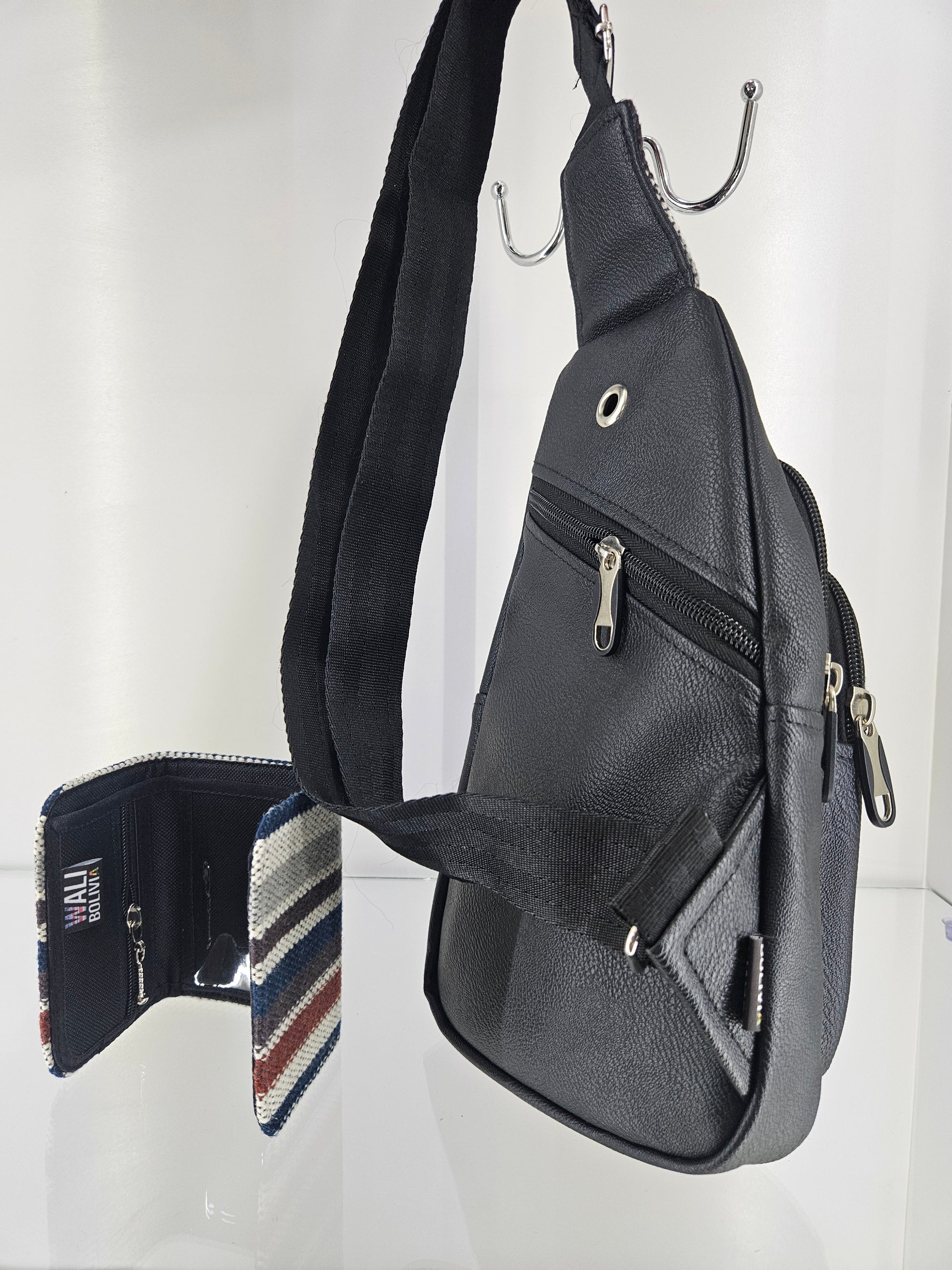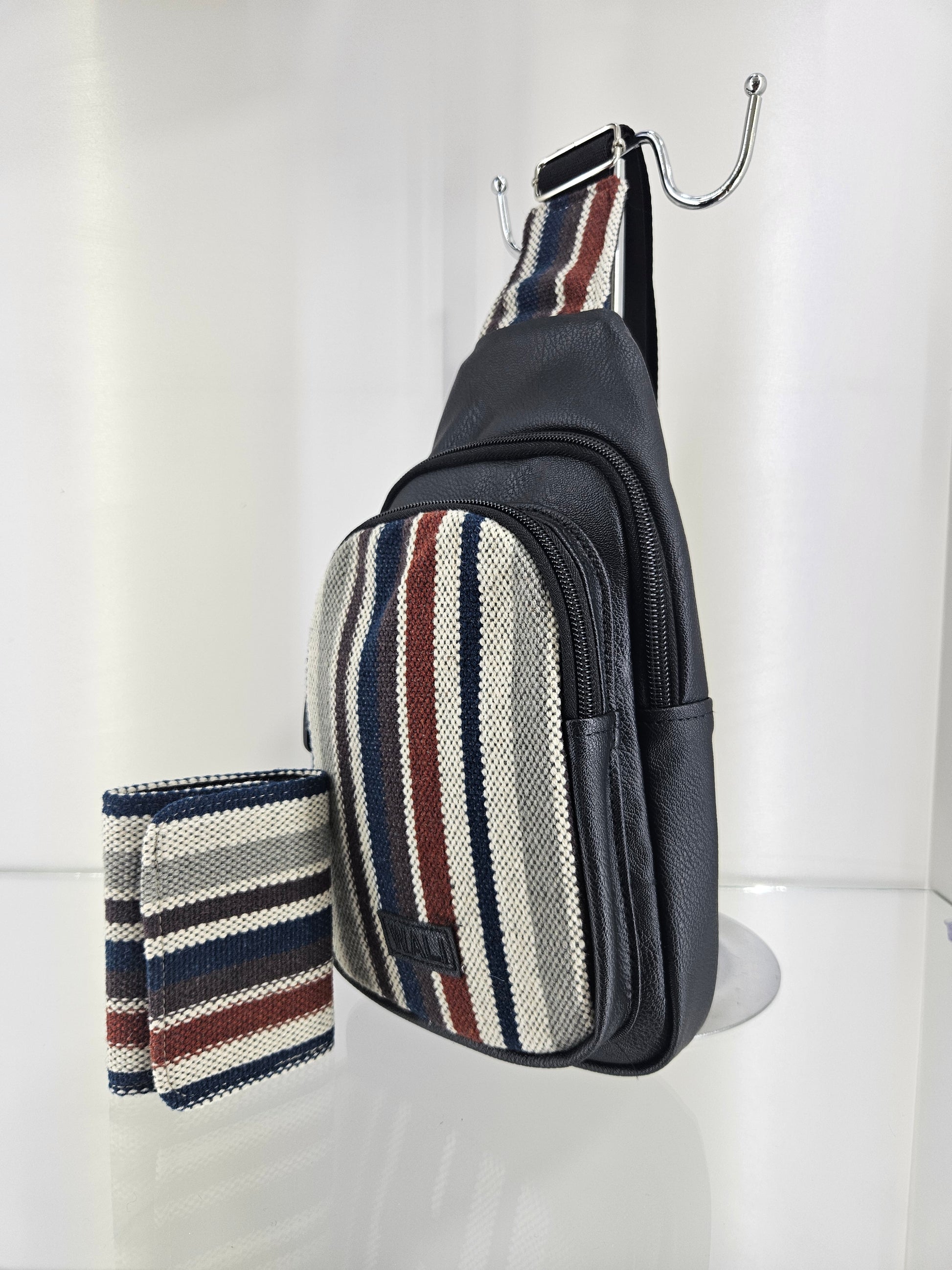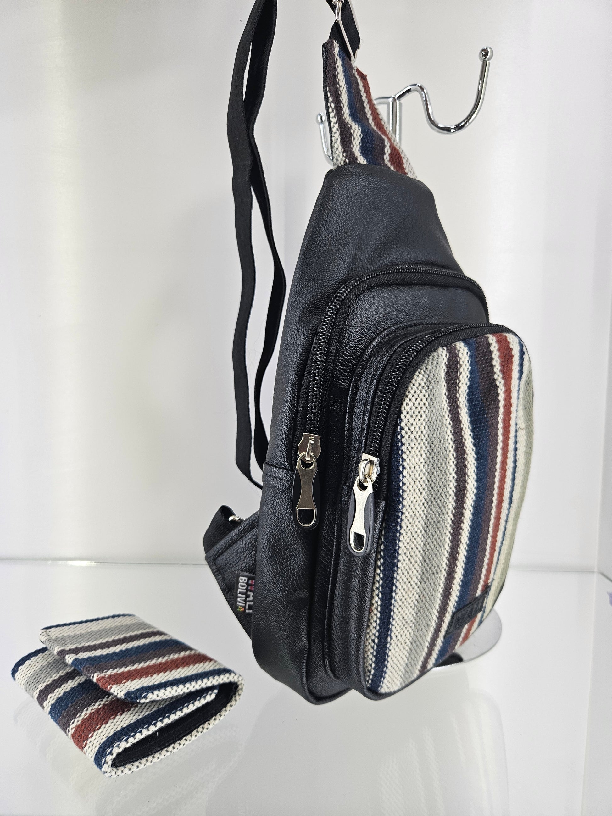 El Combo Pechera y billetera triple combina materiales de aguayo natural y ecocuero, ofreciendo durabilidad y resistencia al desgaste. Su diseño funcional asegura un fácil acceso a tus pertenencias, mientras que el uso de aguayo natural promueve la sostenibilidad. Ideal para quienes buscan estilo y practicidad en su día a día.