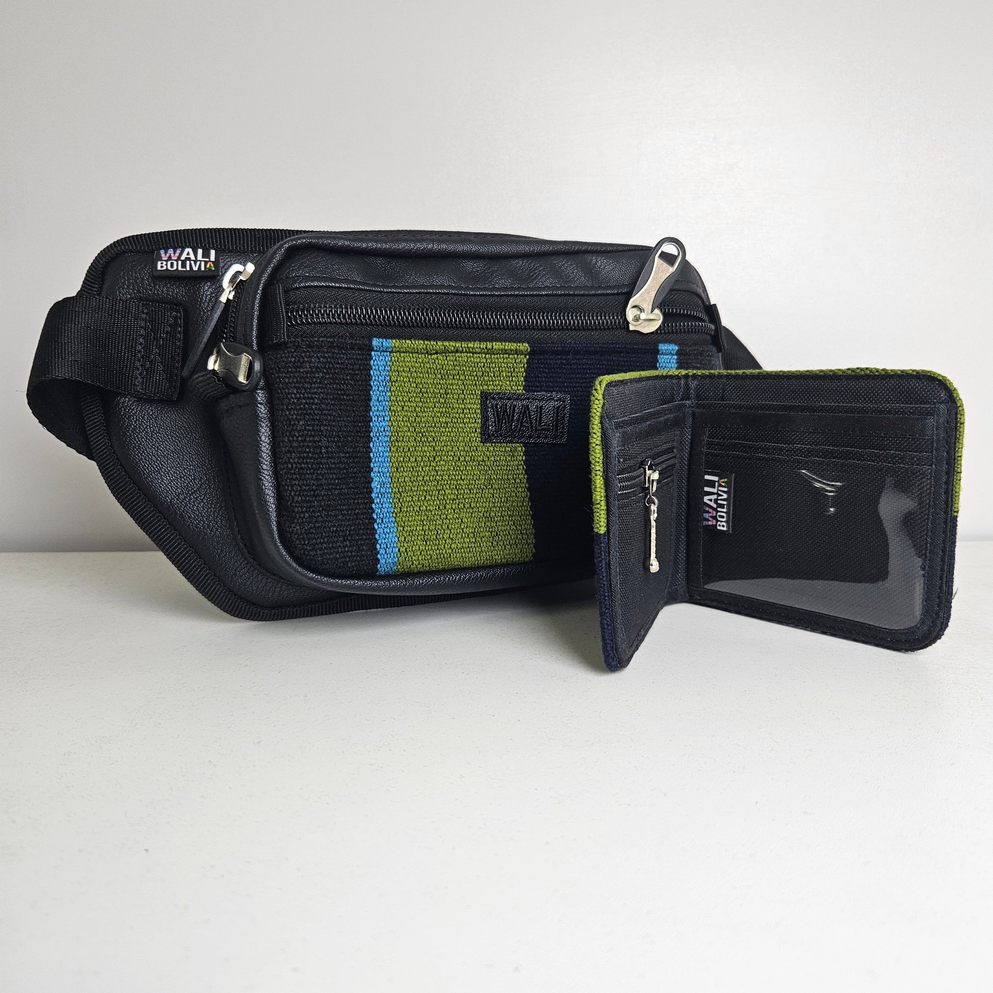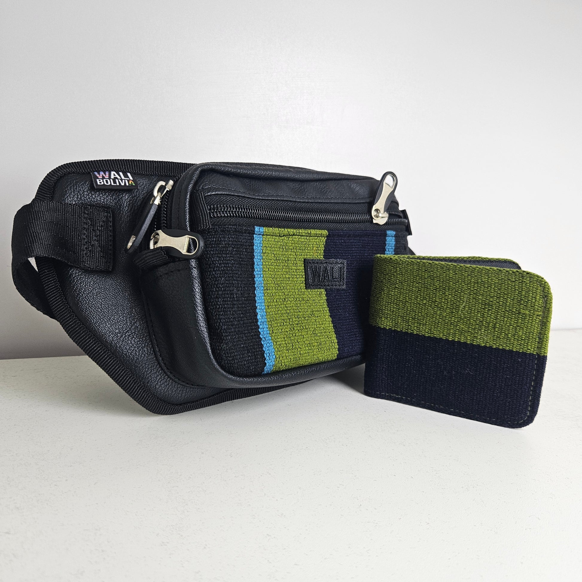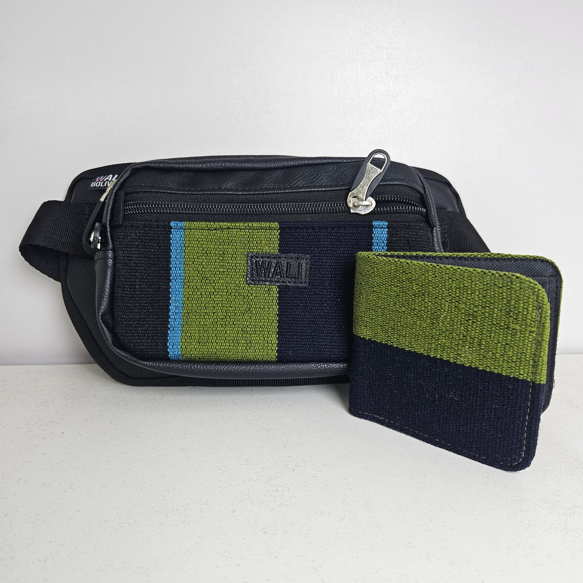 La combinación de riñonera y billetera doble está fabricada con aguayo natural y ecocuero, ofreciendo durabilidad y un estilo distintivo. La riñonera cuadrada permite un almacenamiento práctico y accesible, mientras que la billetera doble proporciona espacio suficiente para tarjetas y efectivo, optimizando la organización personal.