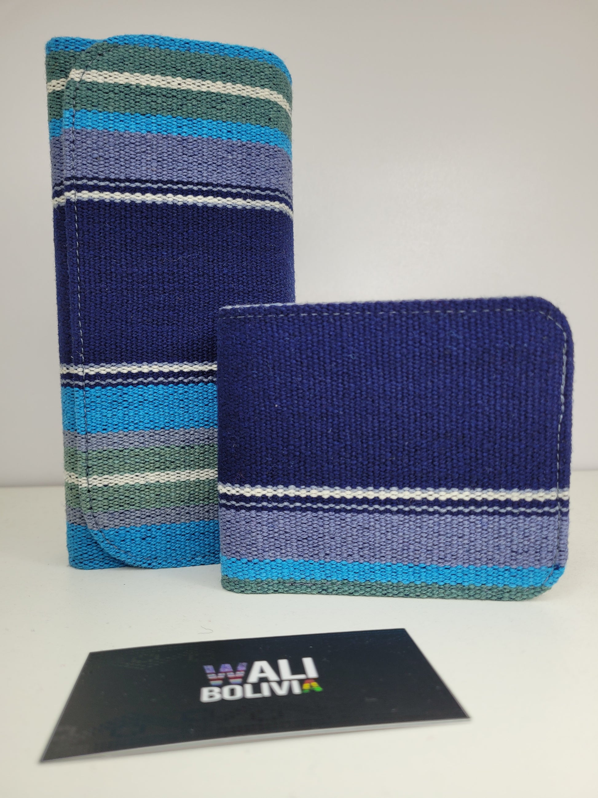 Dúo Pareja (azul) es una combinación perfecta para parejas que buscan accesorios hechos de aguayo natural y engomadas. Incluye una billetera doble para él y una billetera portacelular para ella, todo en un conjunto. ¡Mantengan sus pertenencias organizadas y protegidas juntas, con estilo!