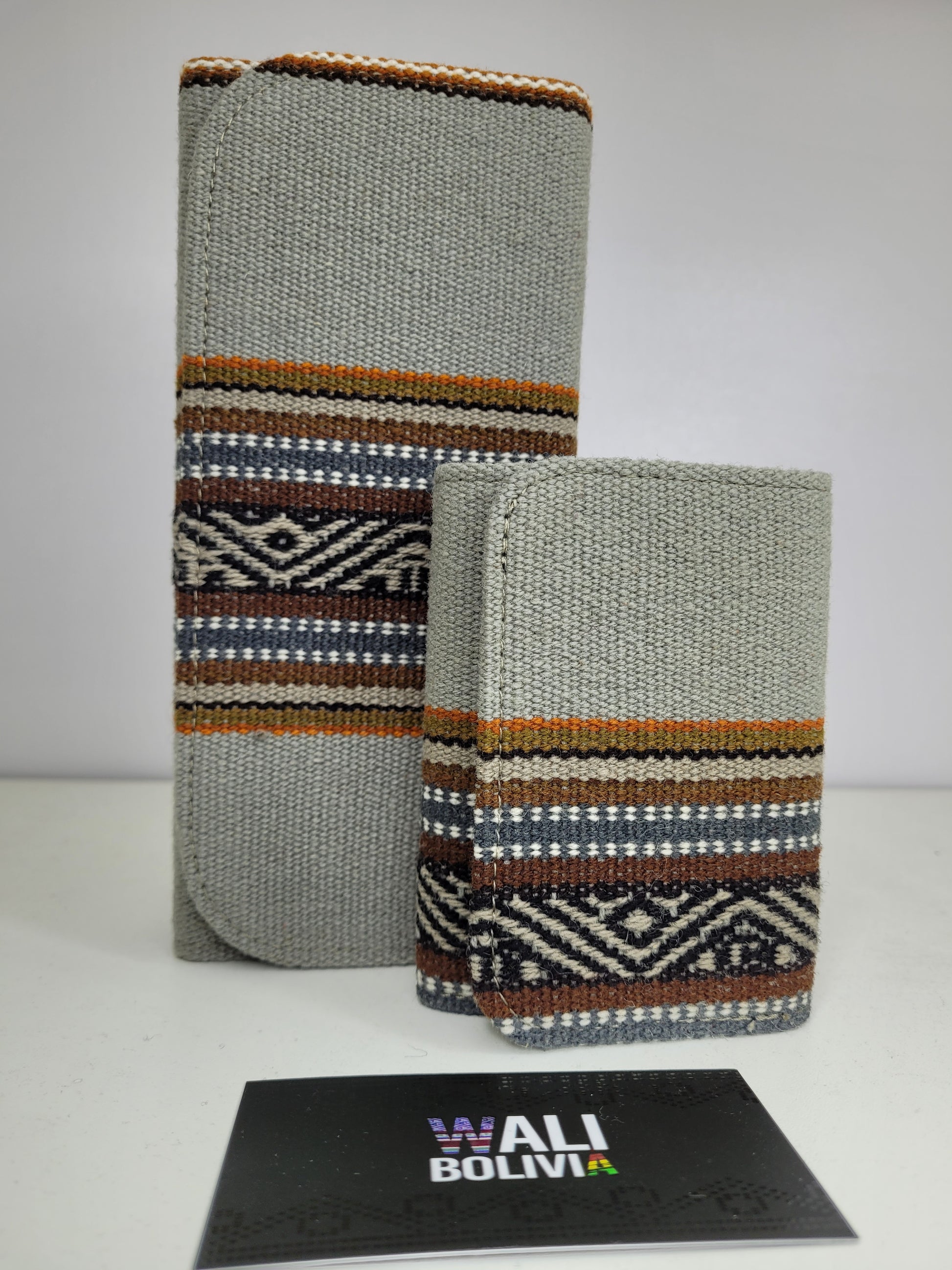 Dúo Pareja (color plomo) es una combinación perfecta para parejas que buscan accesorios hechos de aguayo natural y engomadas. Incluye una billetera triple para él y una billetera portacelular para ella, todo en un conjunto. ¡Mantengan sus pertenencias organizadas y protegidas juntas, con estilo!