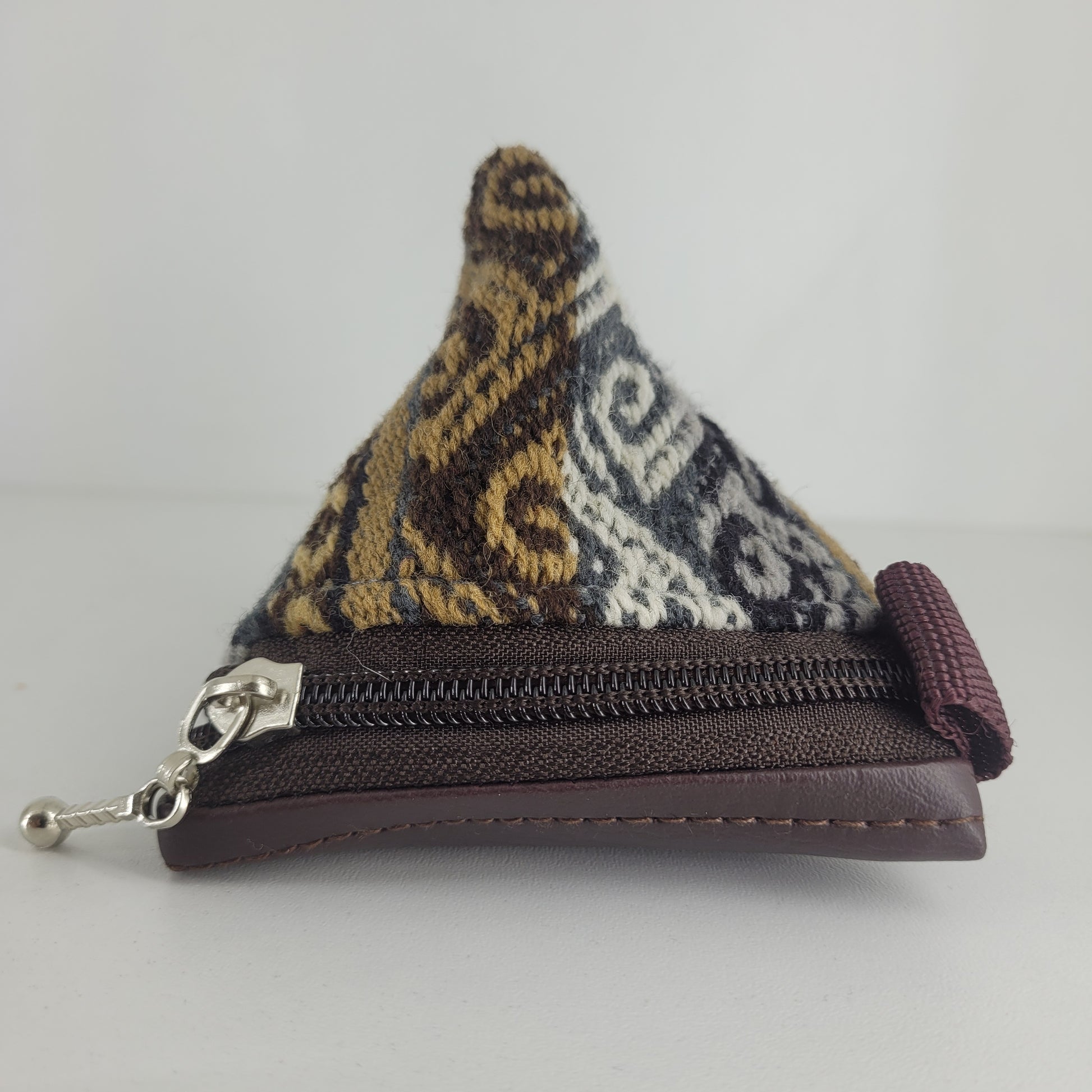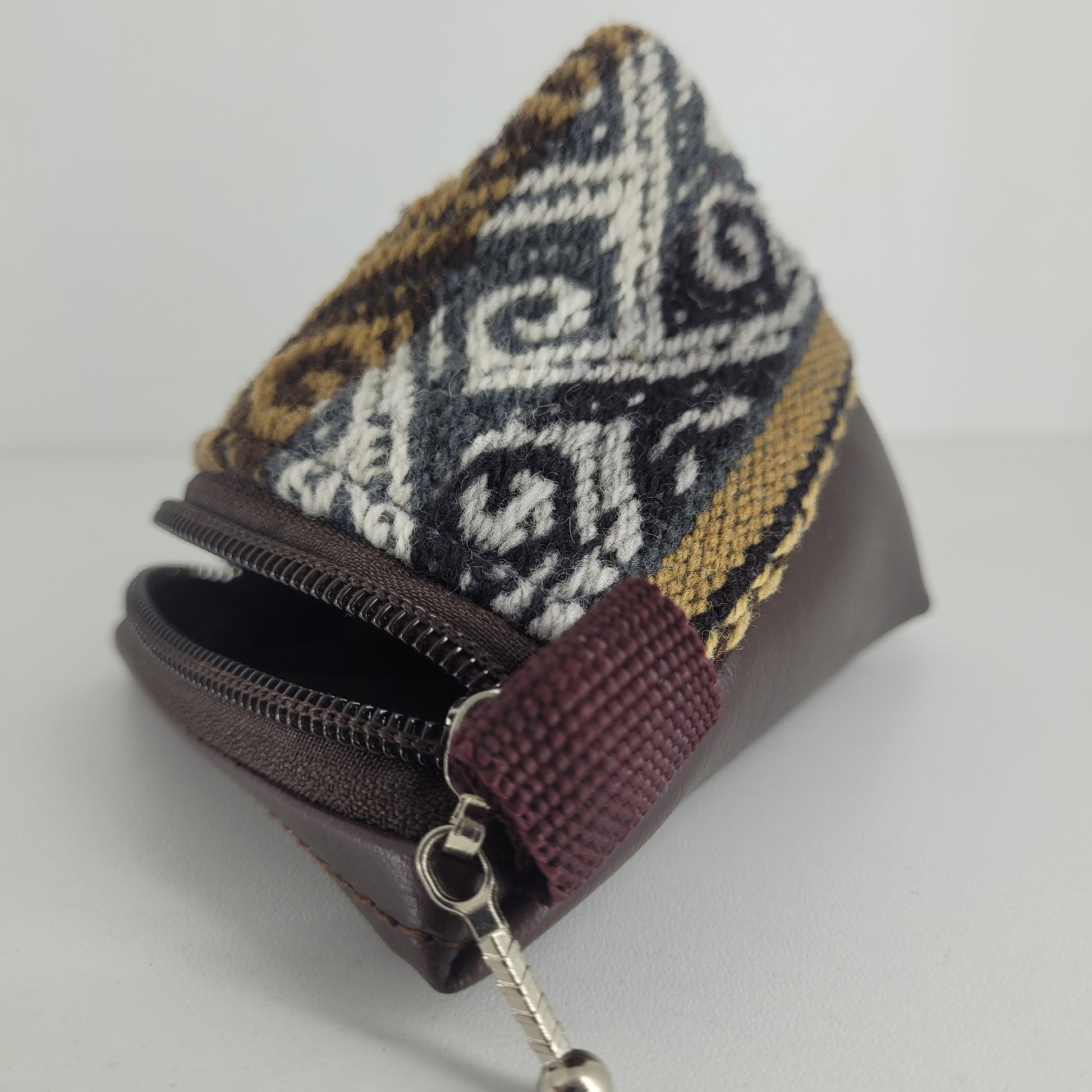 Este monedero triangular está diseñado con materiales de alta calidad: aguayo natural y ecocuero. Además de ser sostenibles, estos materiales le dan un toque único y original al diseño. ¡Lleva tus monedas y tarjetas de una manera elegante y respetuosa con el medio ambiente!