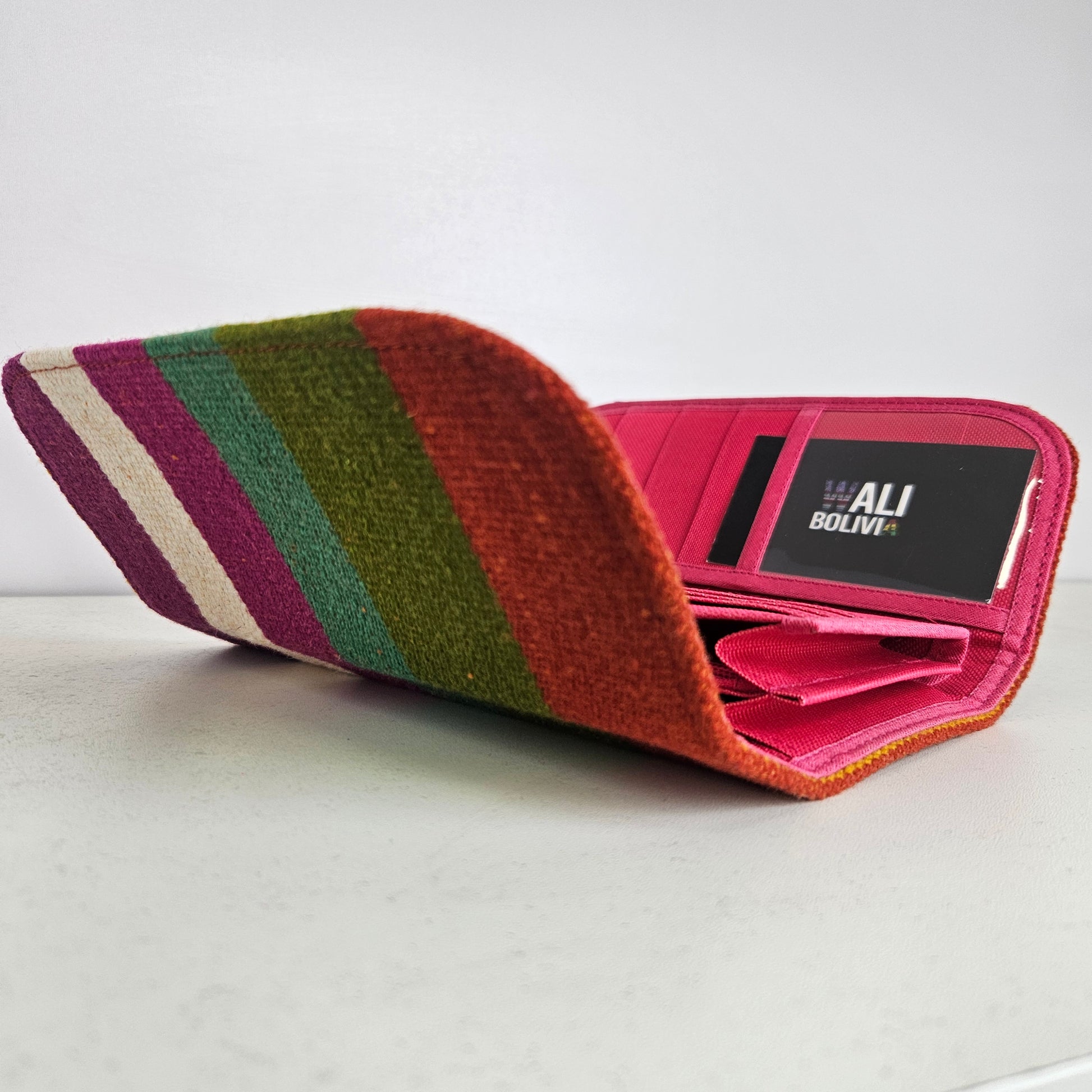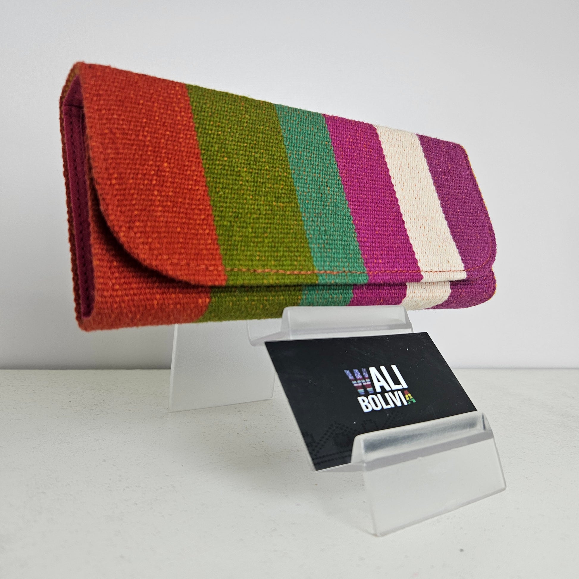 Esta billetera portacelular está confeccionada con aguayo natural y engomada en colores tropicales. Con un diseño único y funcional, te permite tener tu celular y tus objetos personales al alcance de tu mano. Ideal para llevar en tus aventuras tropicales.