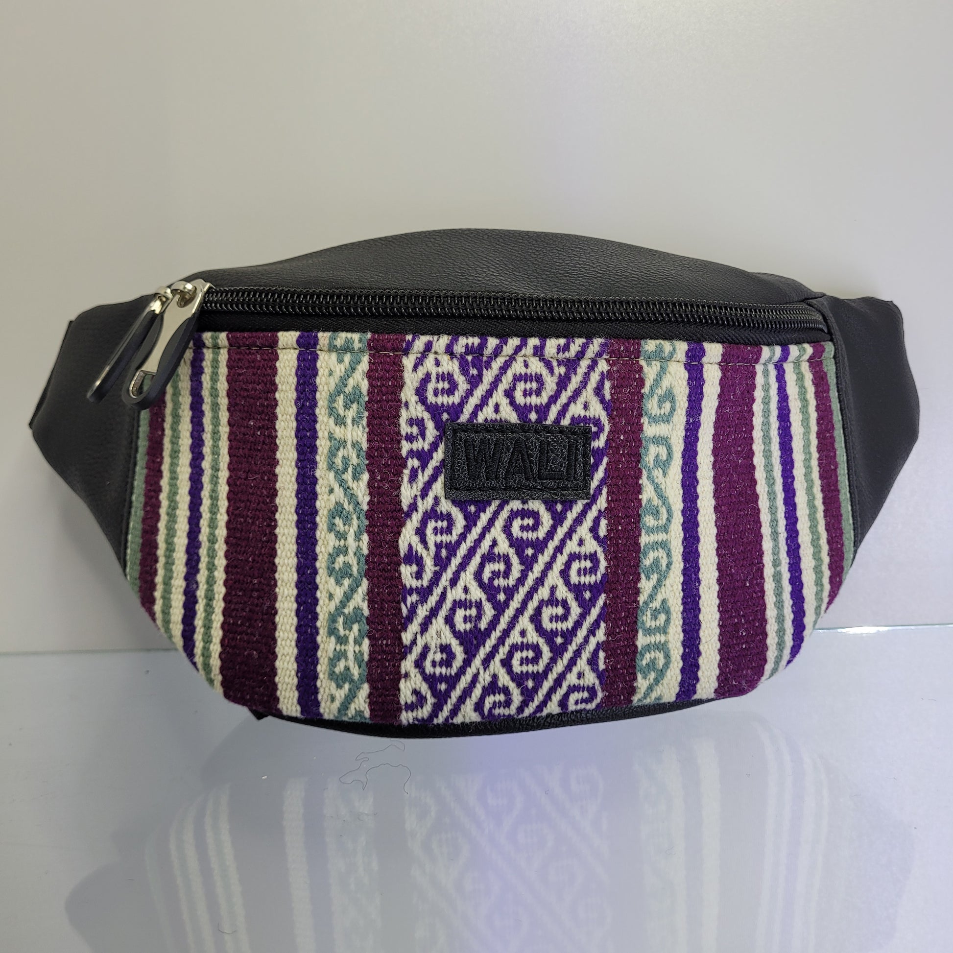 Obtén un estilo clásico y sostenible con nuestra riñonera de ecocuero y aguayo en los hermosos colores lila y blanco, también conocidos como color wali. Hecha con materiales ecológicos, es perfecta para mantener tus pertenencias a salvo mientras disfrutas de tus aventuras al aire libre. ¡Conviértete en un experto en moda y medio ambiente con este accesorio único!