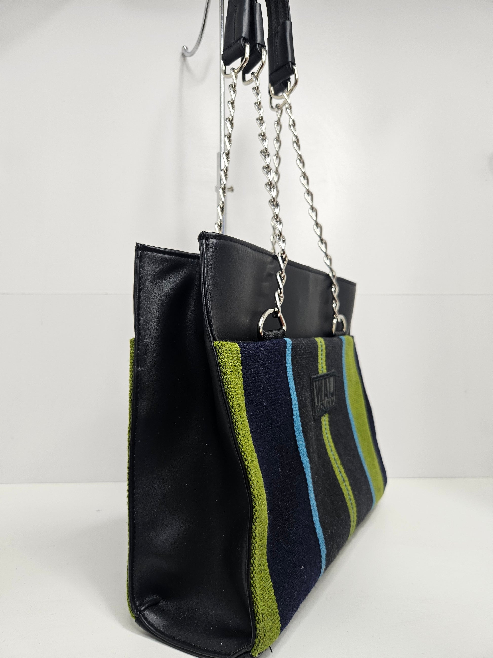 Esta nueva cartera con cadena es ideal para combinar estilo y funcionalidad. Hecha de aguayo natural, esta cartera es duradera y resistente. Con un diseño azul y verde, es perfecta para cualquier ocasión. Lleva tus pertenencias de forma segura y con mucho estilo con esta cartera con cadena.