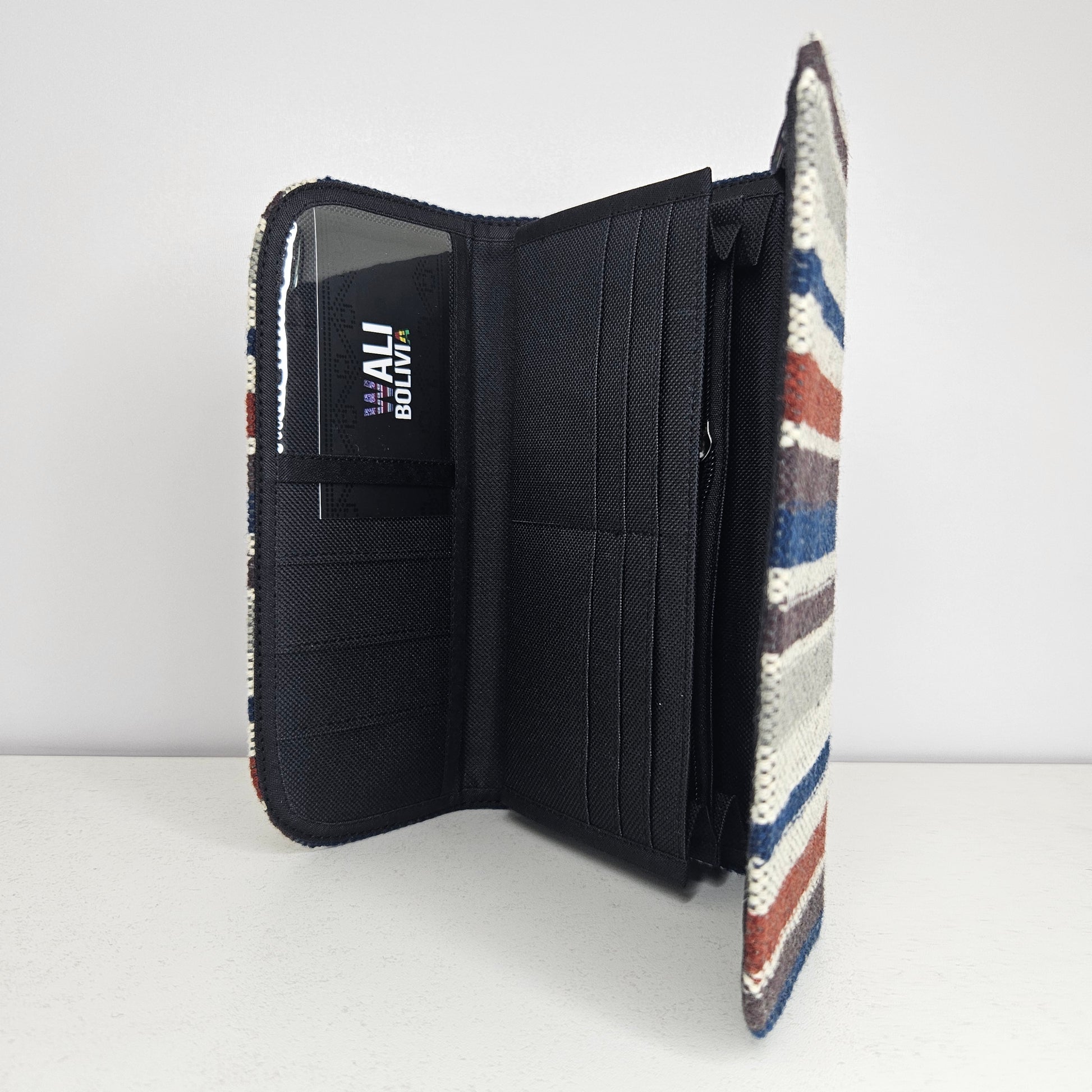 Esta billetera portacelular es el complemento perfecto para tu estilo. Confeccionada con aguayo natural de alta resistencia, ofrece una combinación única y duradera. Mantén tus pertenencias seguras y a la moda con este producto de calidad.